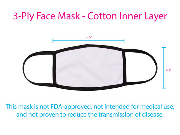 These three-layer face masks feature a 100% polyester outer layer and a cotton inner layer that follows CDC recommendations for cloth facial coverings.