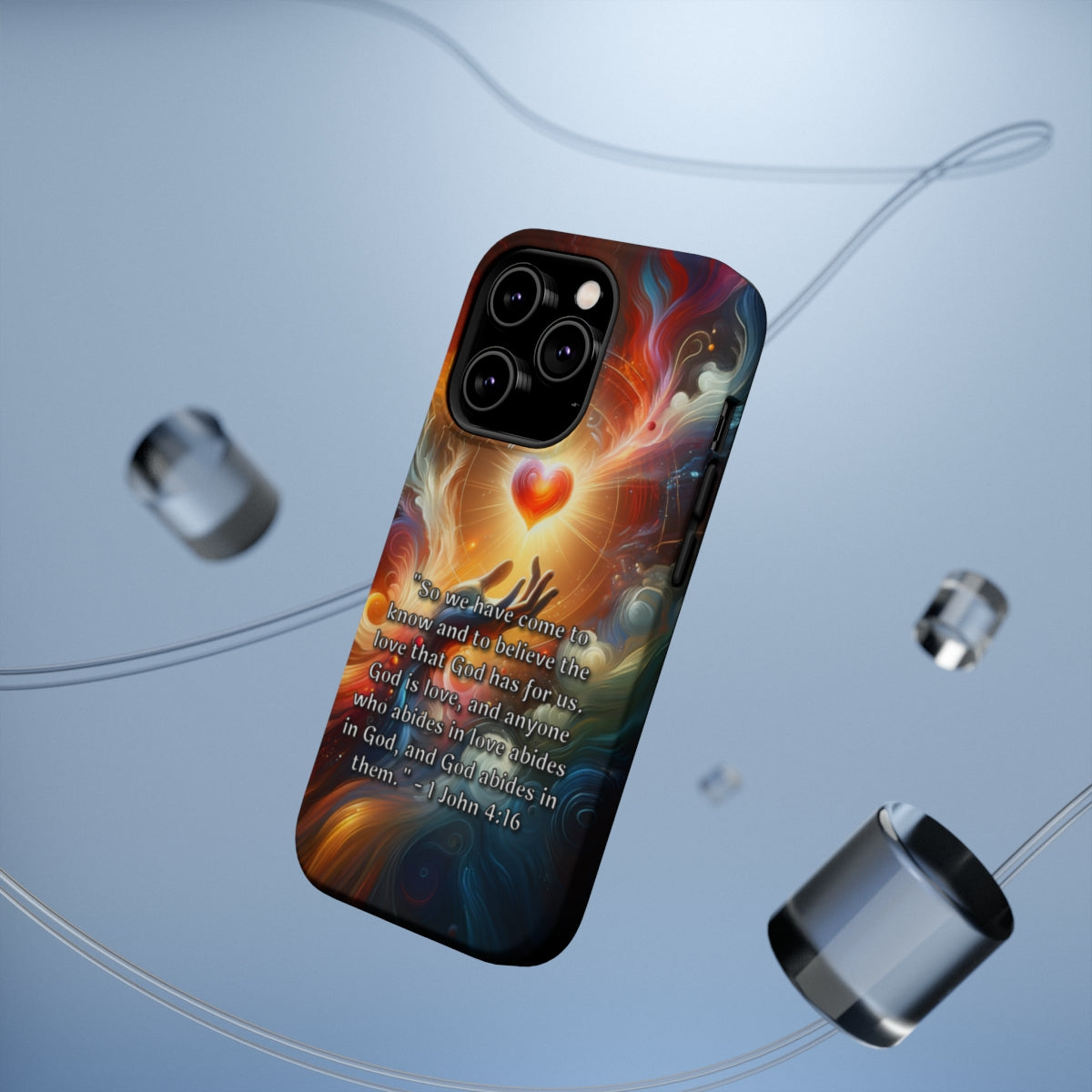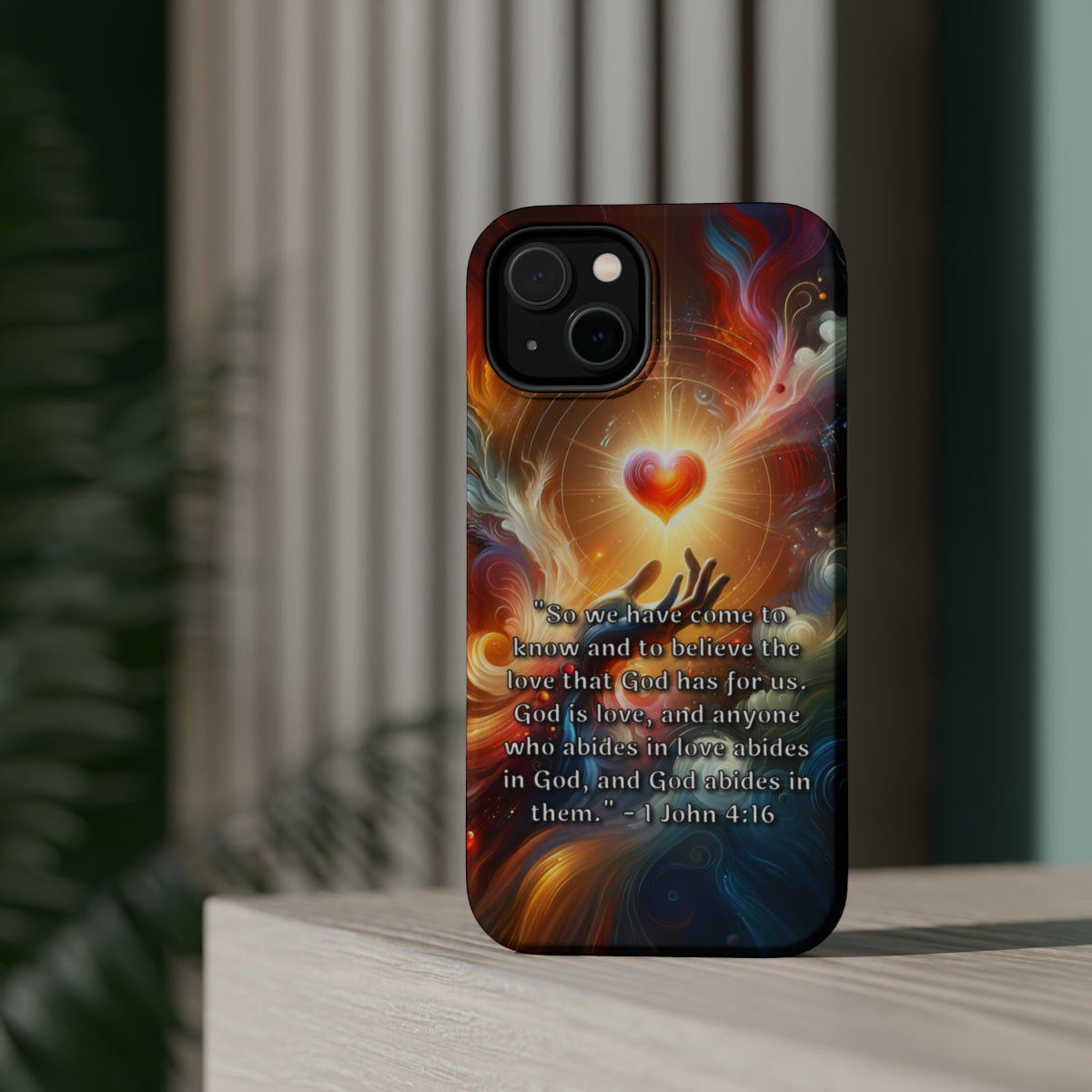 DistinctInk Tough Case for Apple iPhone, Compatible with MagSafe Charging - "1 John 4:16 - Experiencing God's Eternal Love"