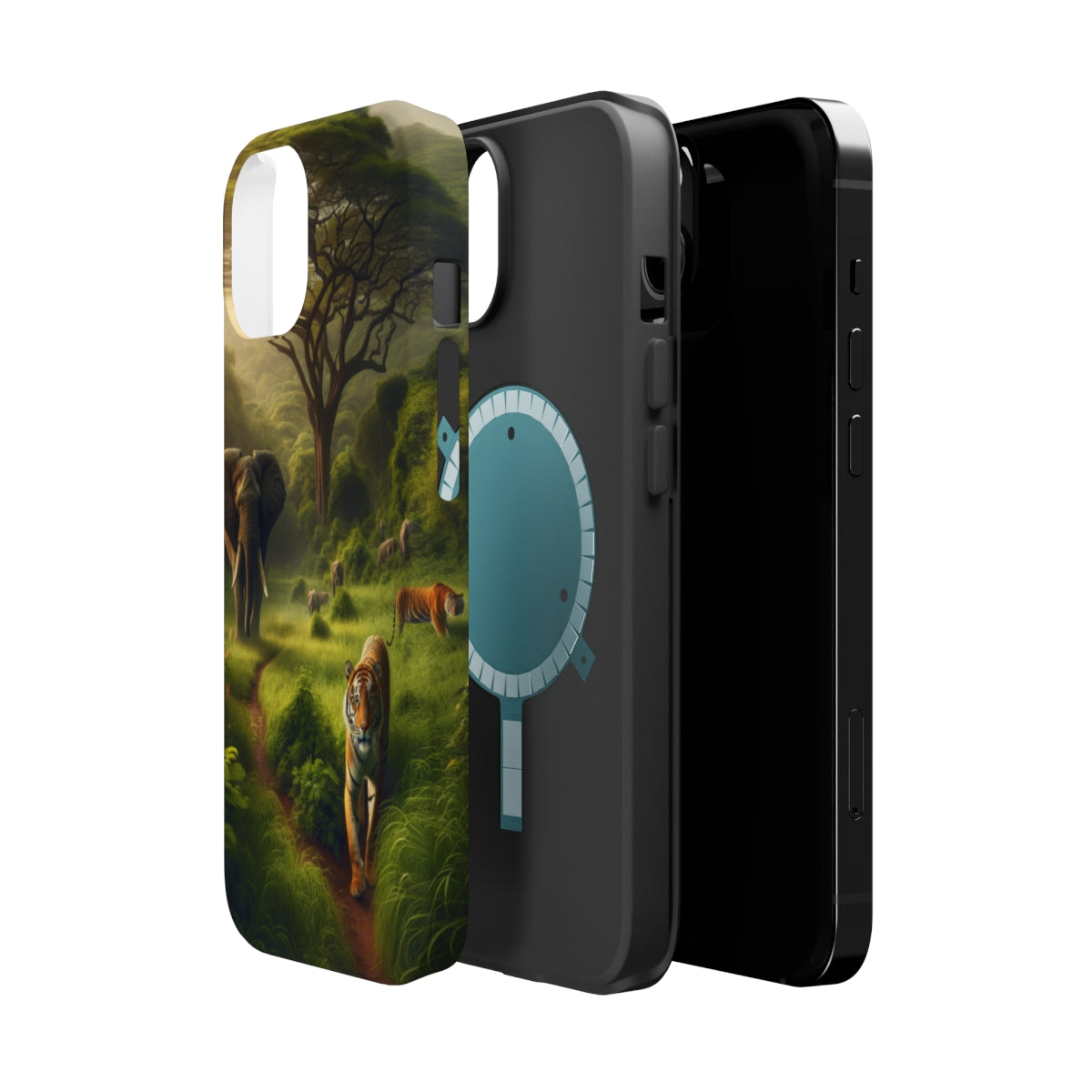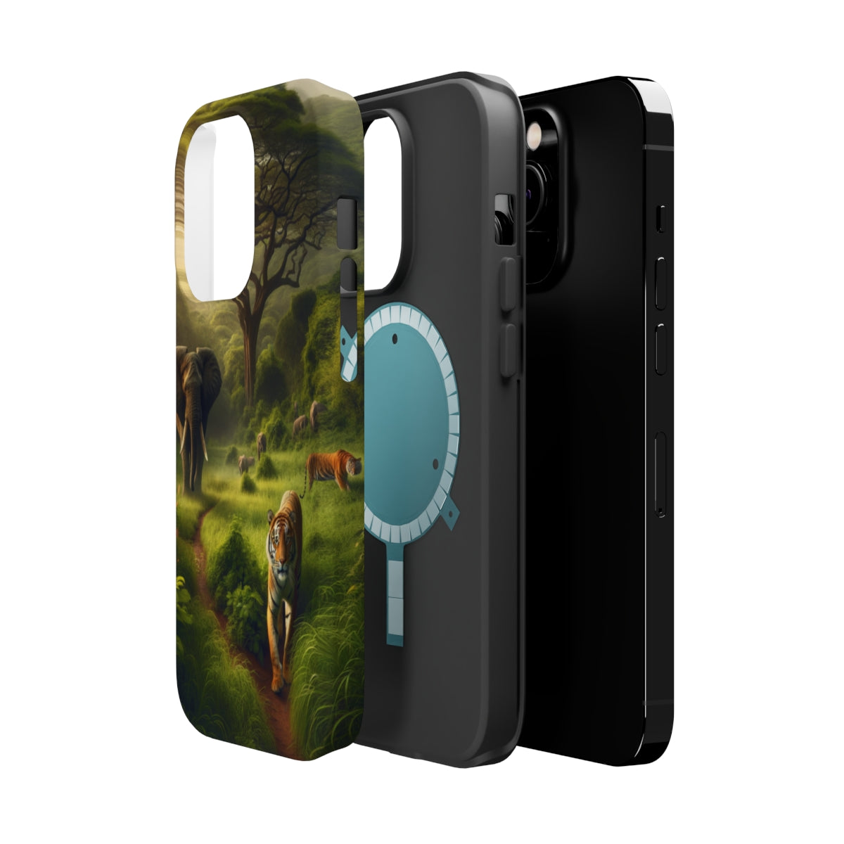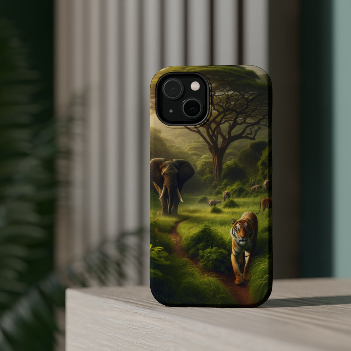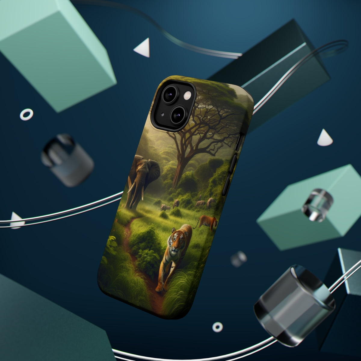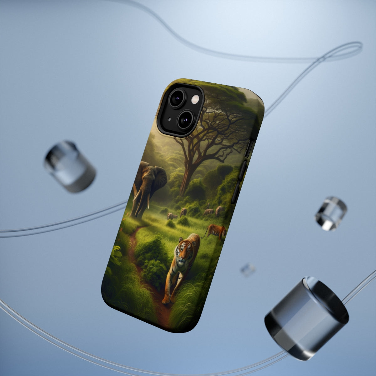 DistinctInk Tough Case for Apple iPhone, Compatible with MagSafe Charging - "A Majestic Meeting: Tigers and Elephants Roam Together"