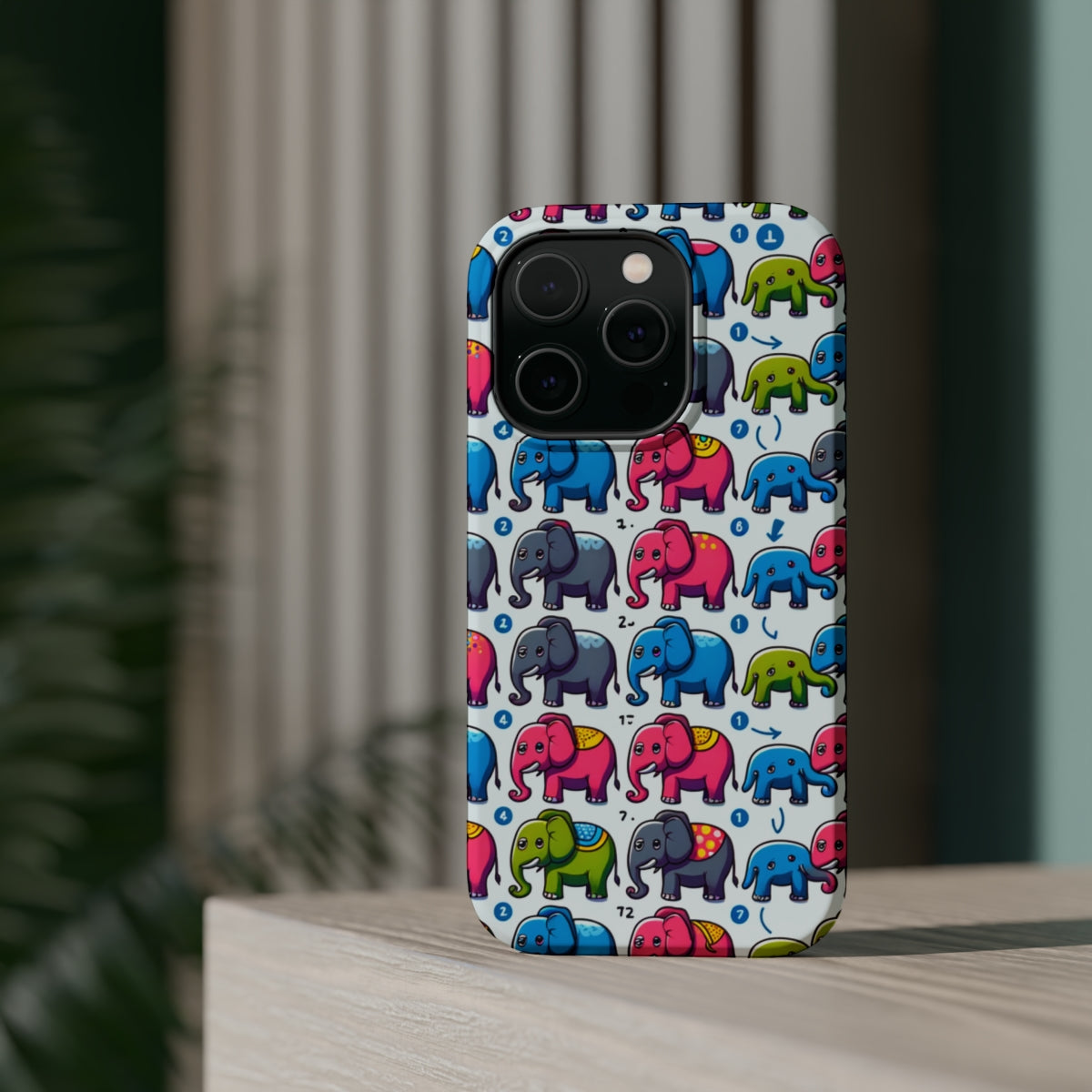 DistinctInk Tough Case for Apple iPhone, Compatible with MagSafe Charging - "Cheerful and Colorful Elephant Fiesta Pattern"