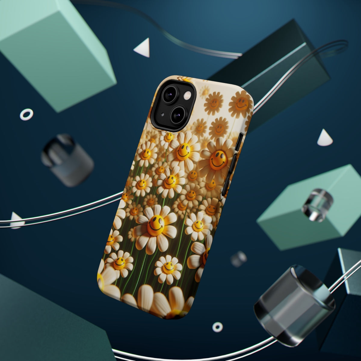 DistinctInk Tough Case for Apple iPhone, Compatible with MagSafe Charging - "Dancing Smiley Daisies: A Floral Delight"