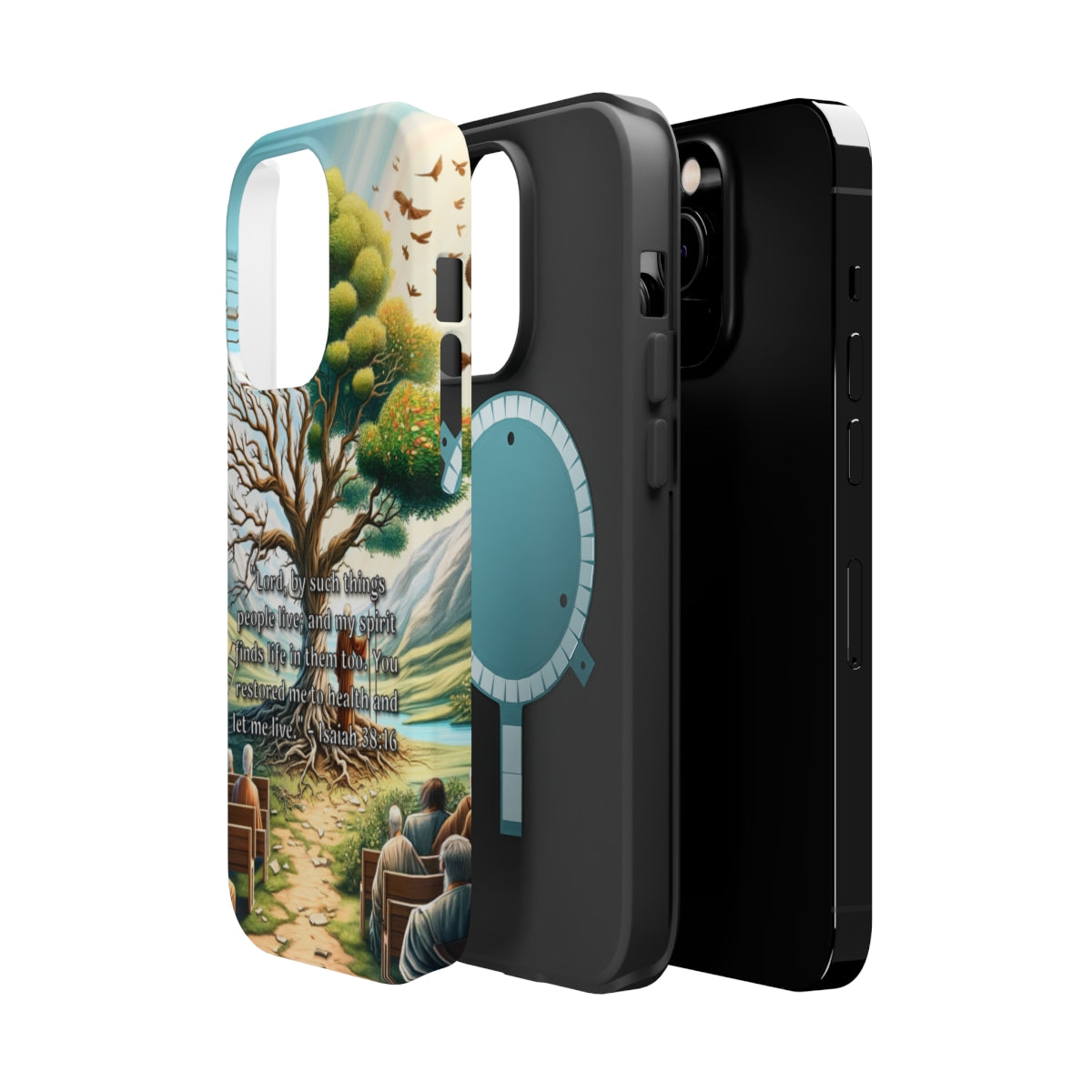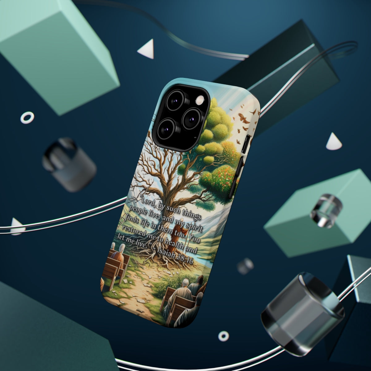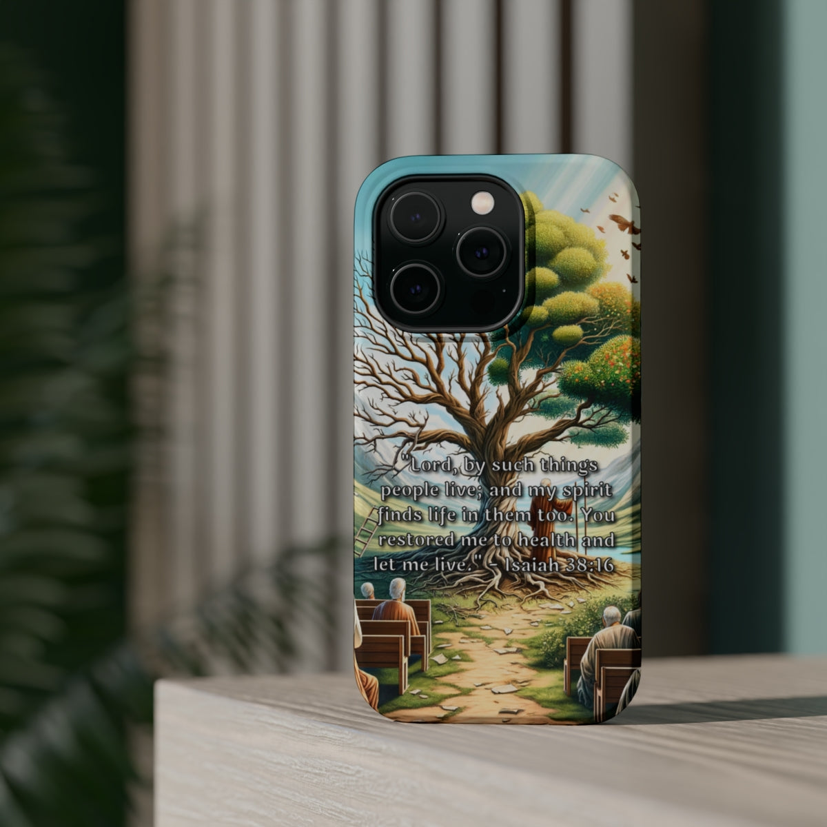 DistinctInk Tough Case for Apple iPhone, Compatible with MagSafe Charging - "Finding Life and Restoration in Isaiah 38:16"