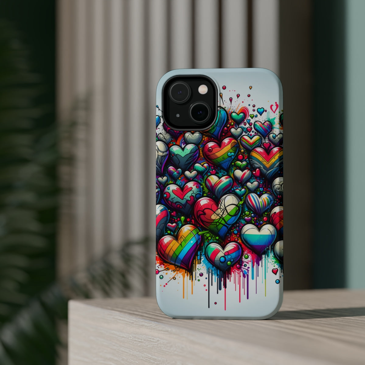 DistinctInk Tough Case for Apple iPhone, Compatible with MagSafe Charging - "Lively Love: Graffiti Hearts in Rainbow"