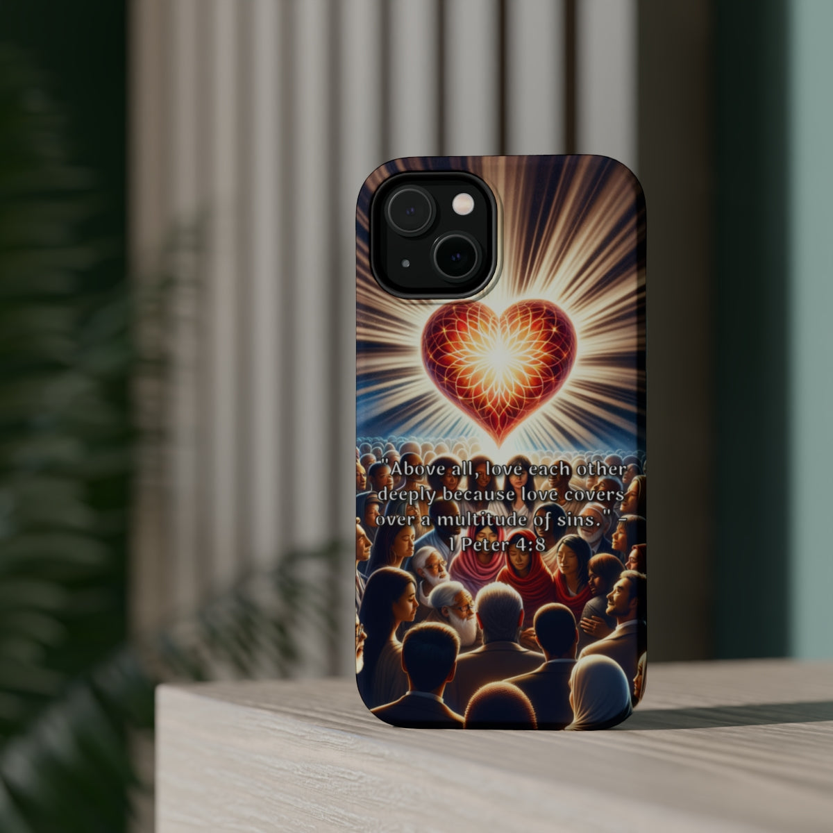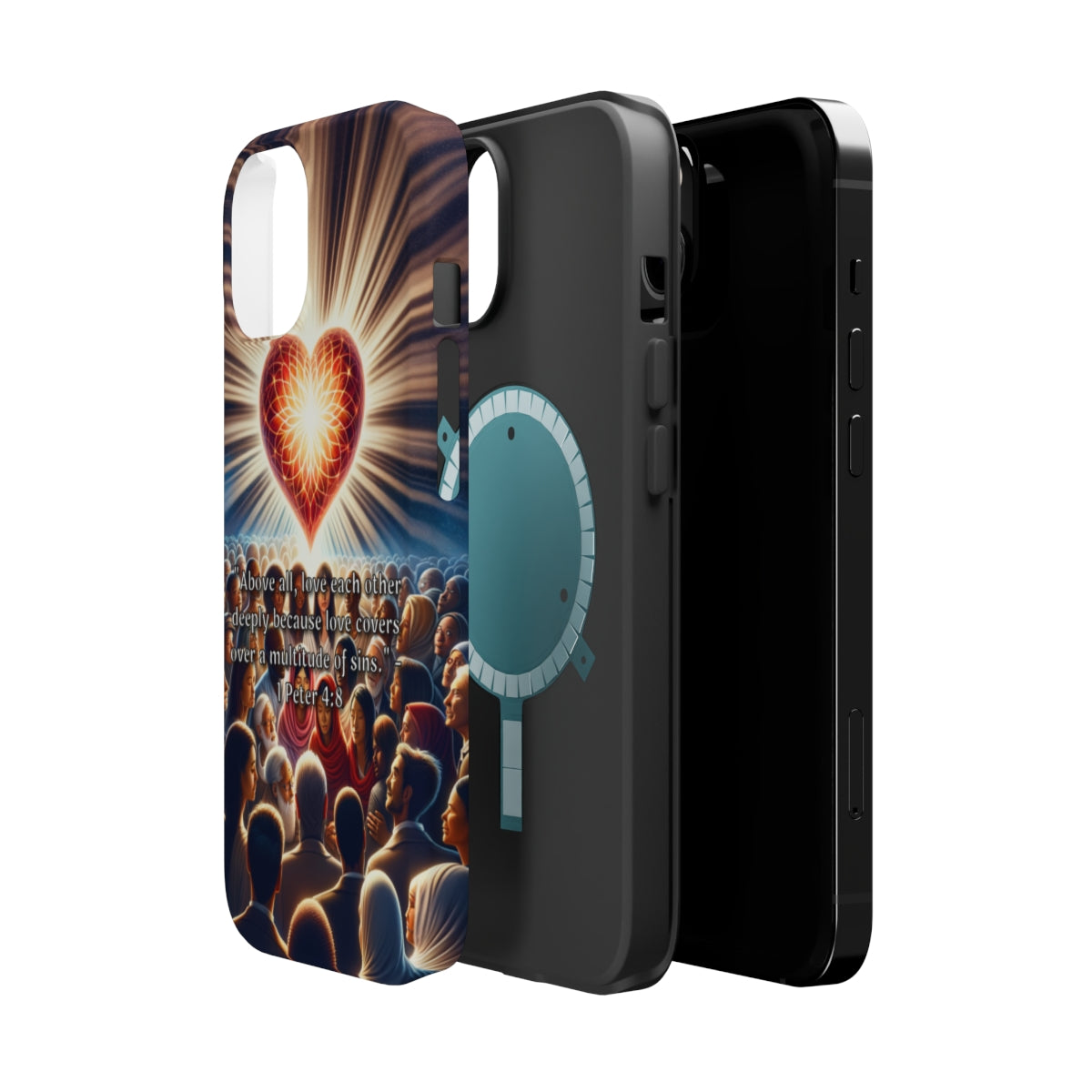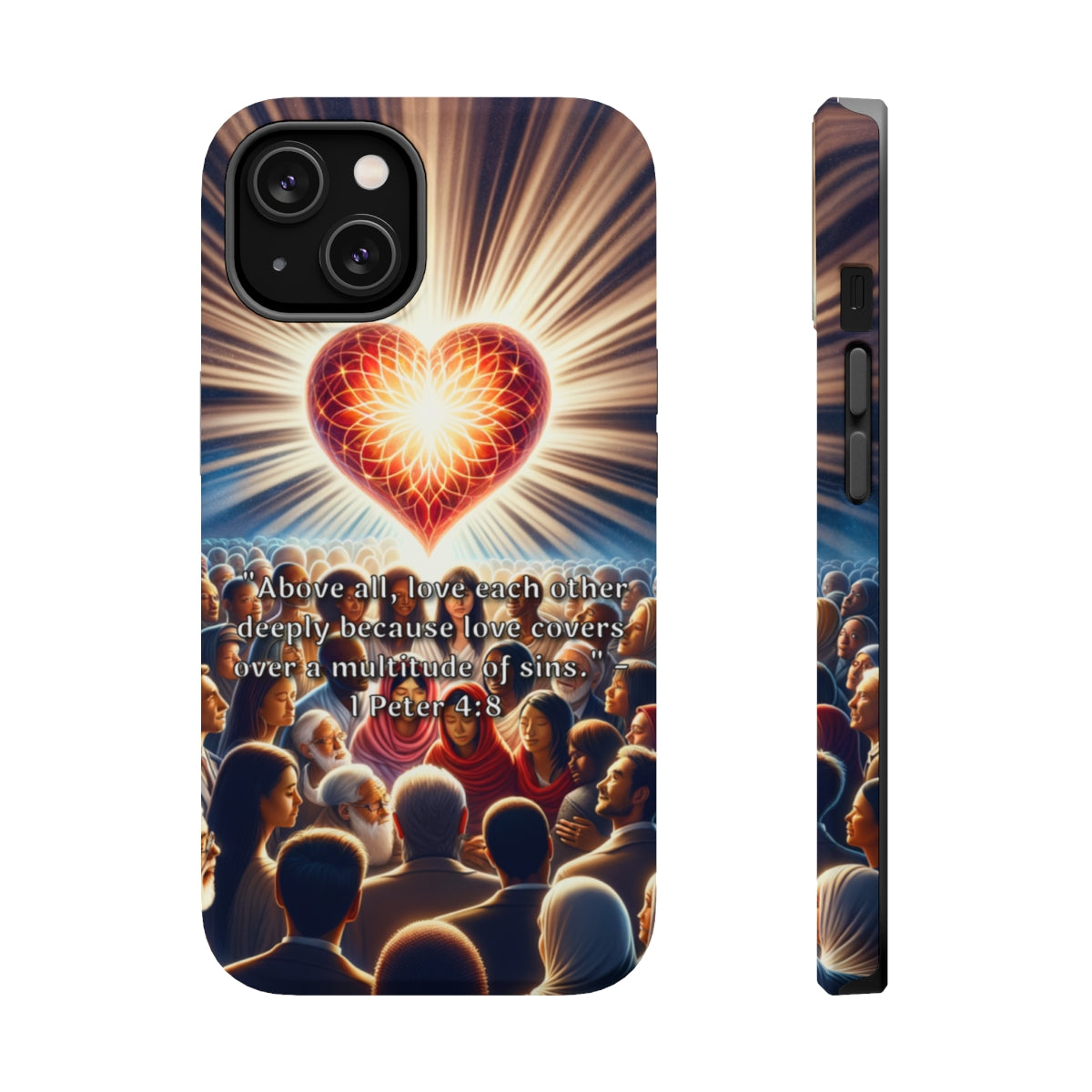 DistinctInk Tough Case for Apple iPhone, Compatible with MagSafe Charging - "Love Covers Sins: 1 Peter 4:8 Bible Verse"