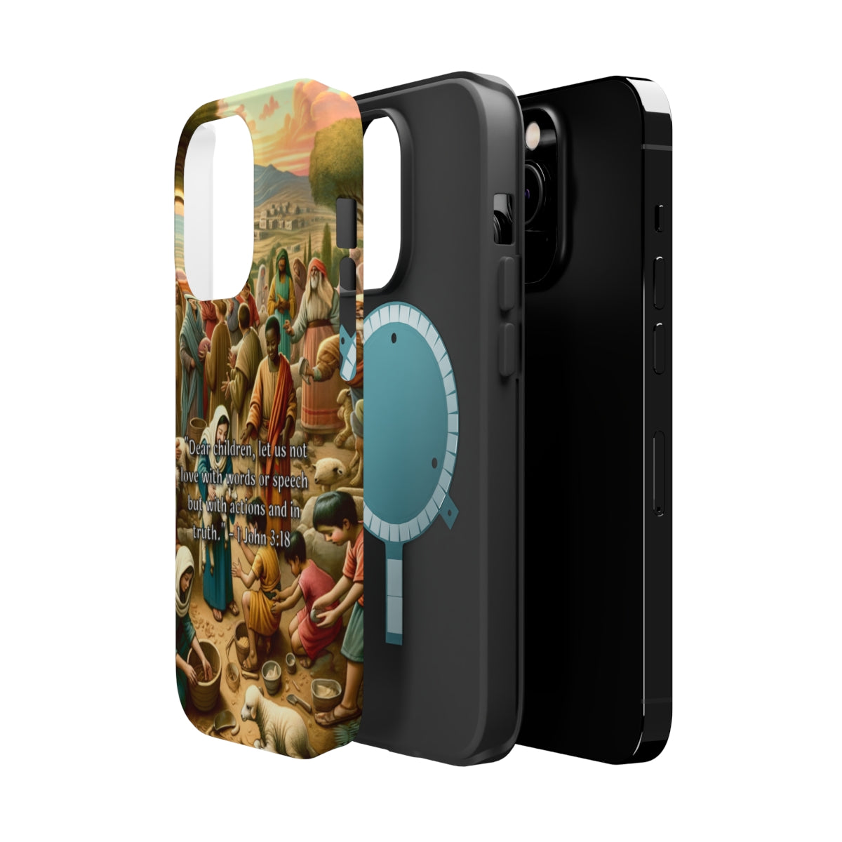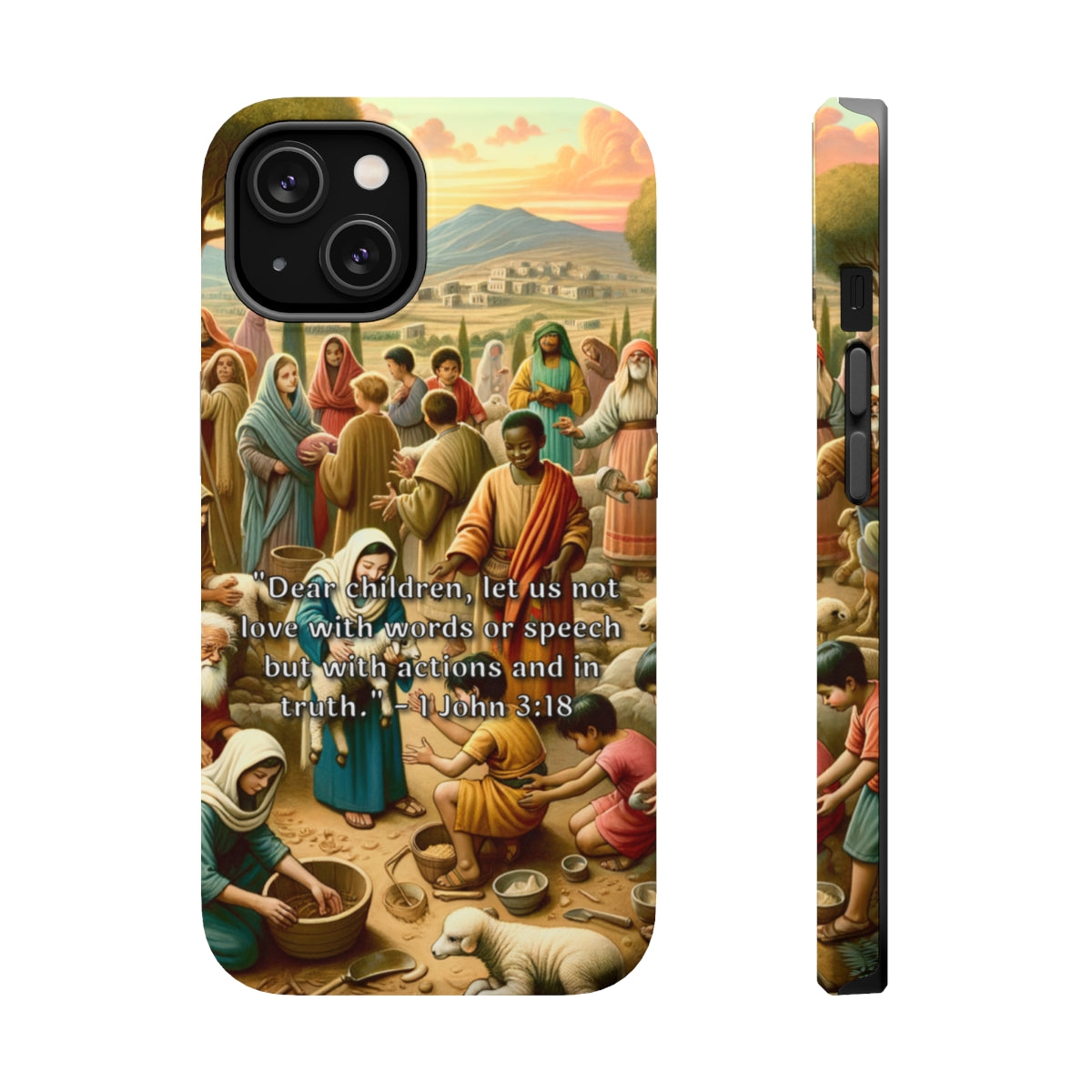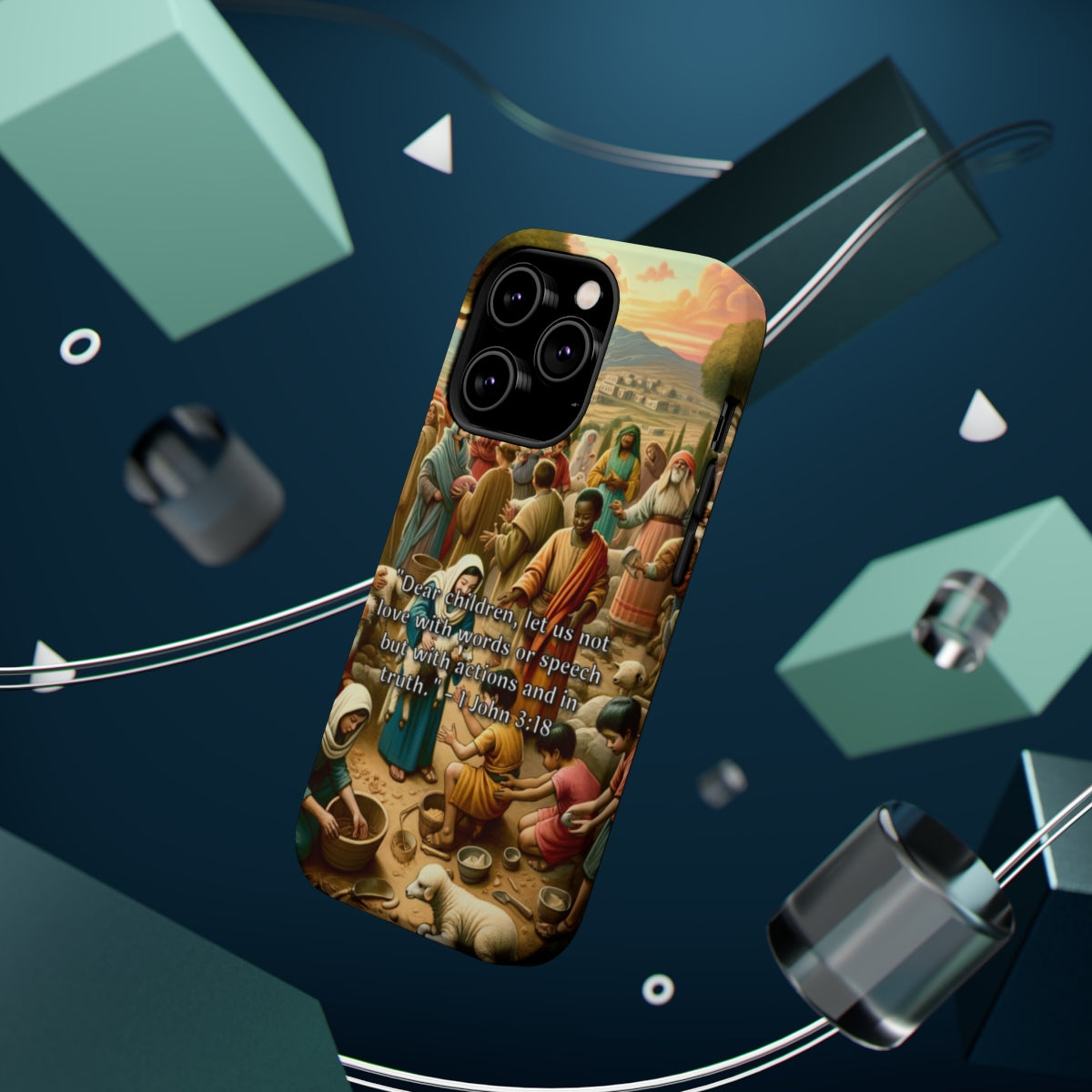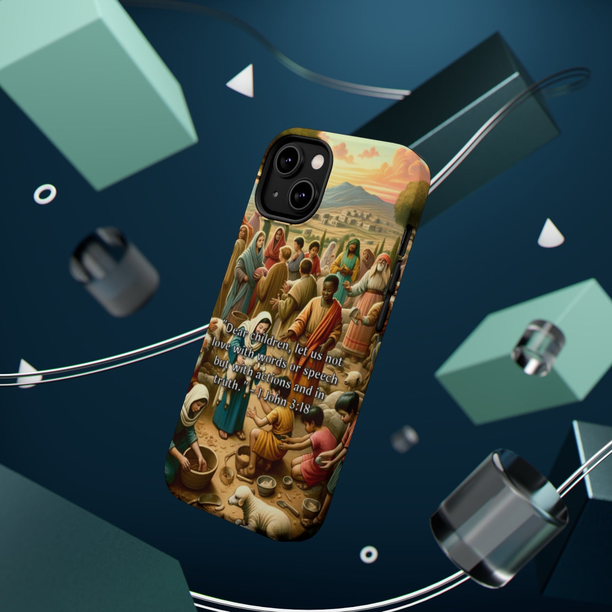 DistinctInk Tough Case for Apple iPhone, Compatible with MagSafe Charging - "Love not just with words but actions - 1 John 3:18"