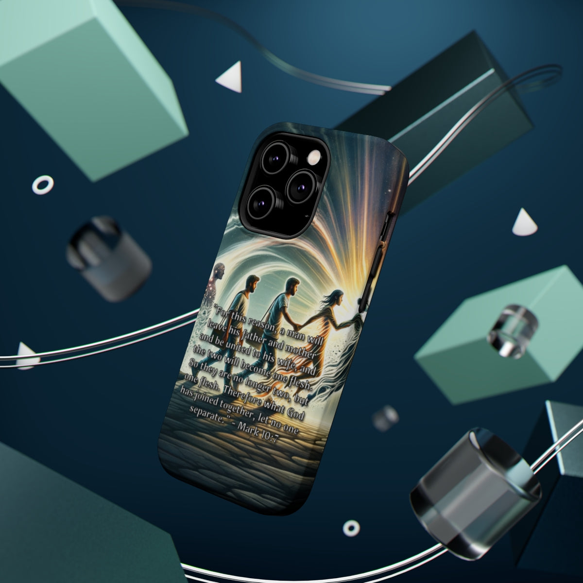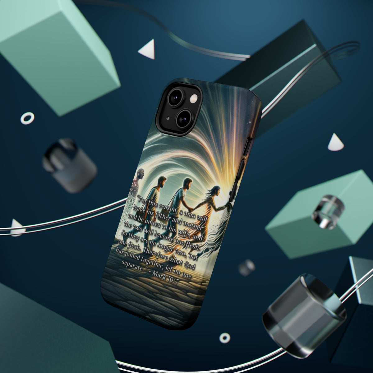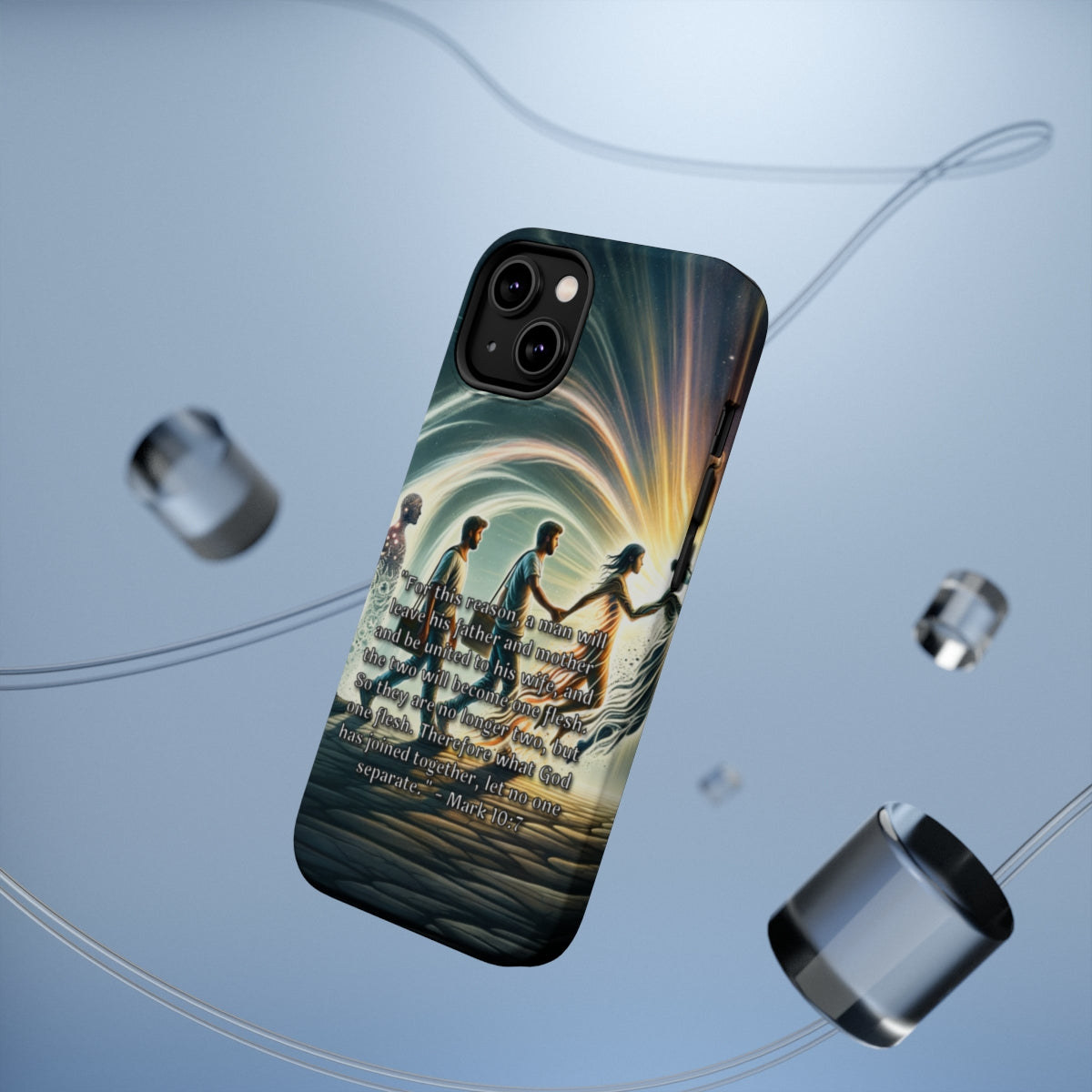 Introducing the DistinctInk ToughCase for Apple iPhone, the perfect companion for your Wireless charging experience! This incredible case not only protects your phone from life's little accidents, but also showcases Mark 10:7: God's Unbreakable Union Between Husband and Wife, printed directly on the case. Now, you can carry your faith with you everywhere you go!