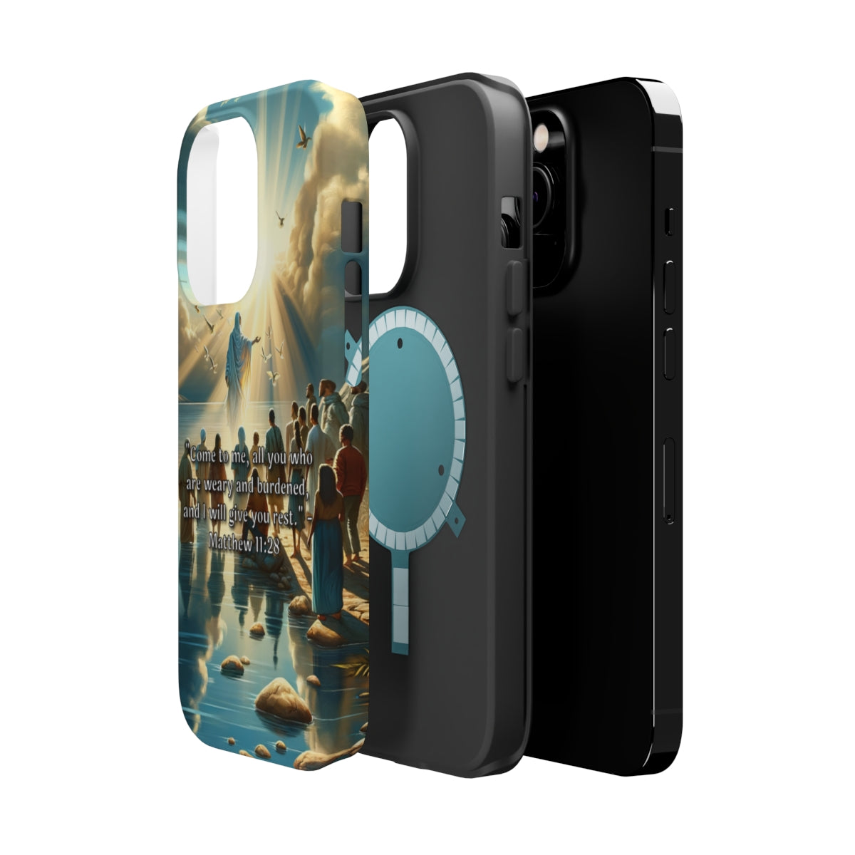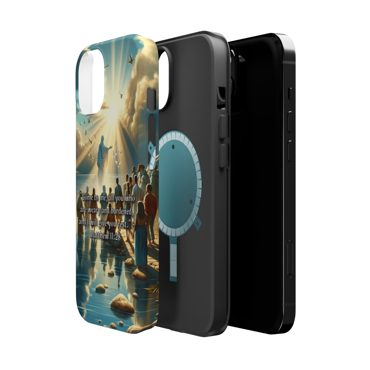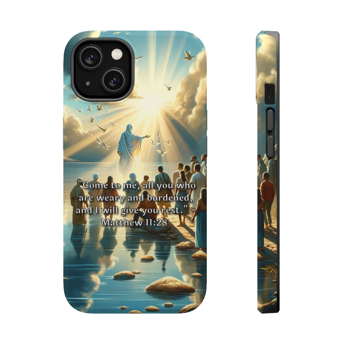 DistinctInk Tough Case for Apple iPhone, Compatible with MagSafe Charging - "Matthew 11:28 - Find Rest: A Call for Weary Souls"