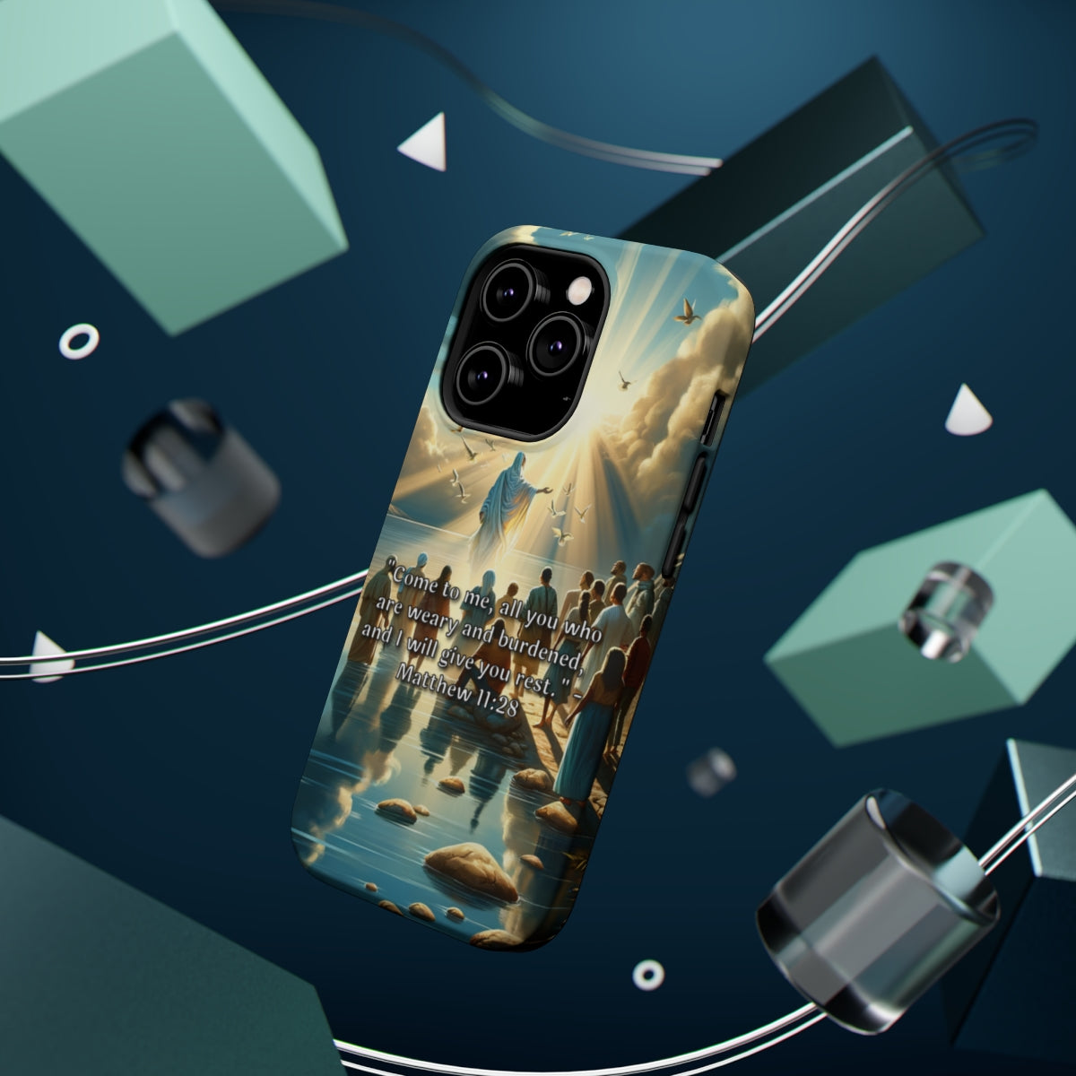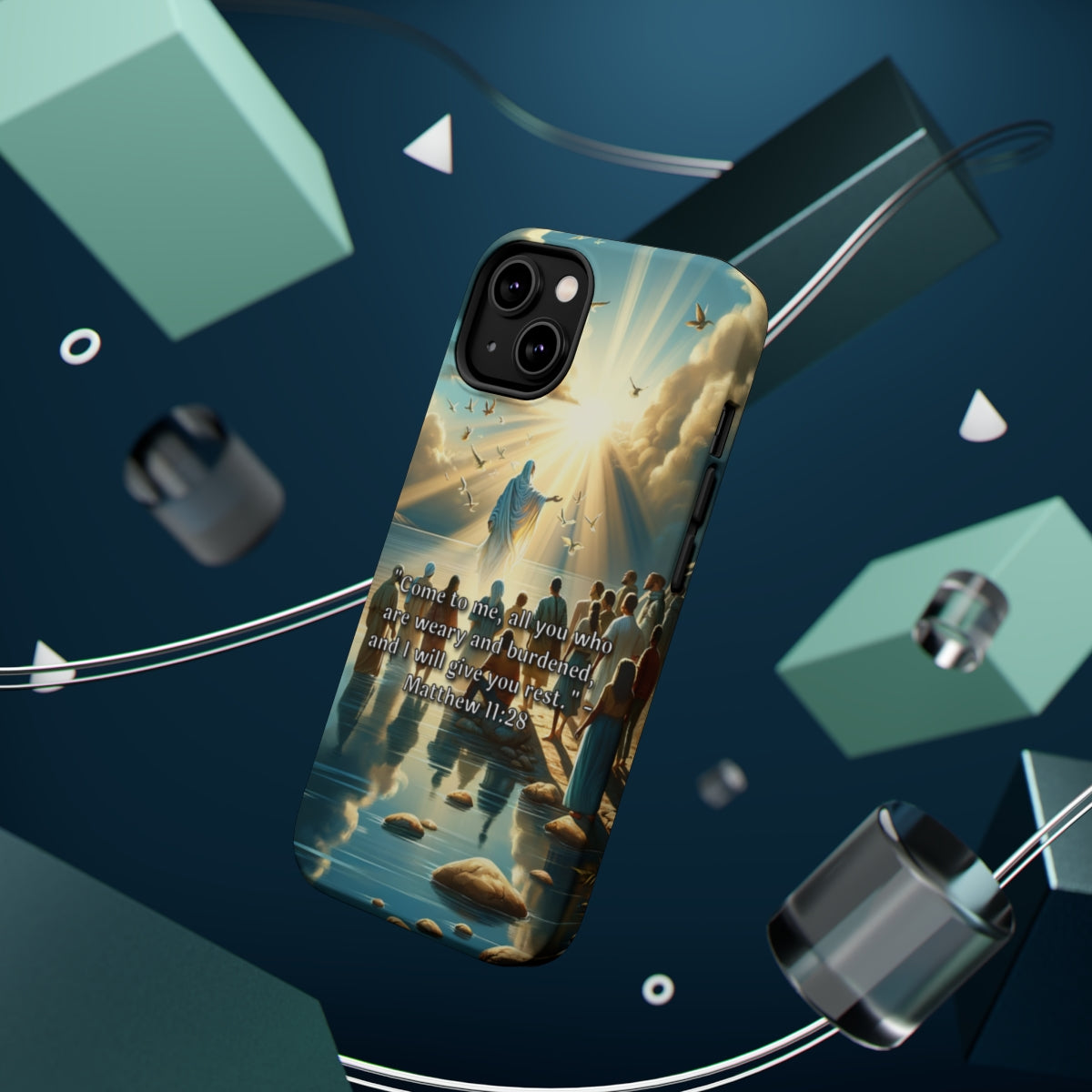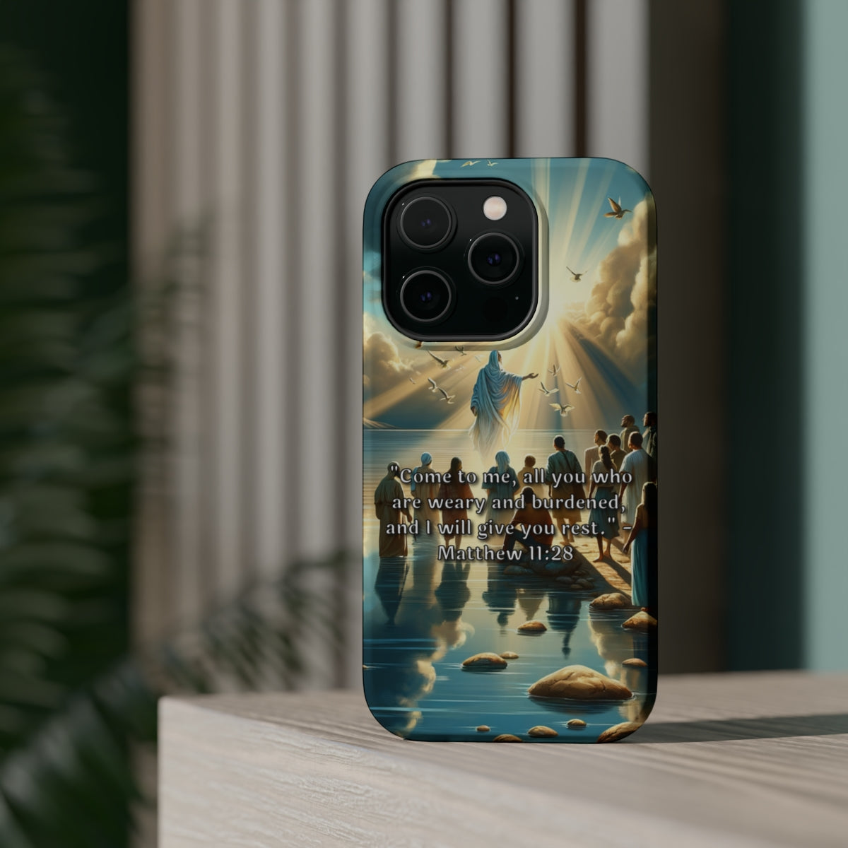 DistinctInk Tough Case for Apple iPhone, Compatible with MagSafe Charging - "Matthew 11:28 - Find Rest: A Call for Weary Souls"