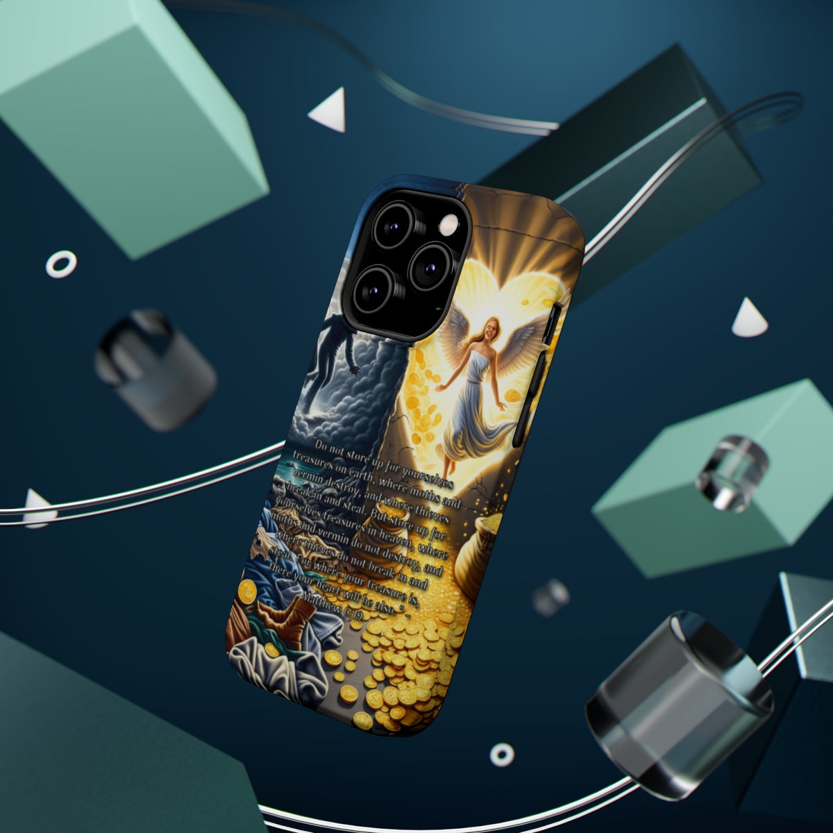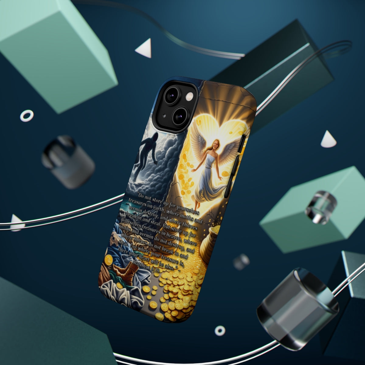 DistinctInk Tough Case for Apple iPhone, Compatible with MagSafe Charging - "Matthew 6:19 - Storing Treasures in Heaven, Not Earth"