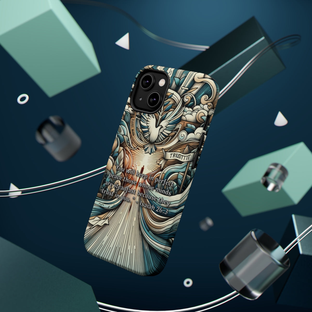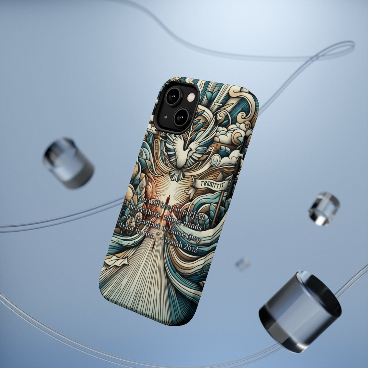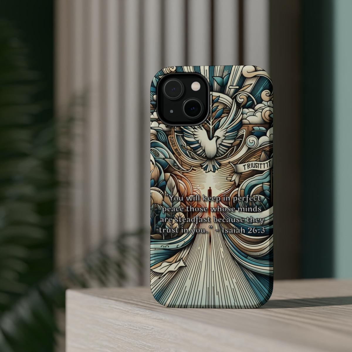DistinctInk Tough Case for Apple iPhone, Compatible with MagSafe Charging - Peace Through Steadfast Trust: Isaiah 26:3