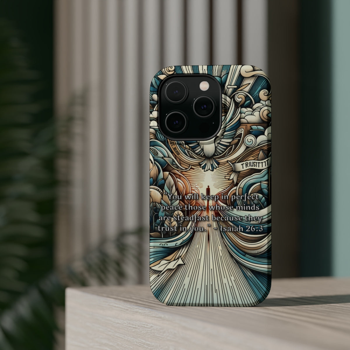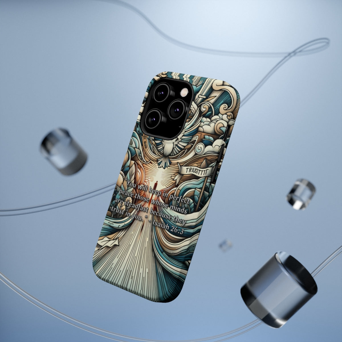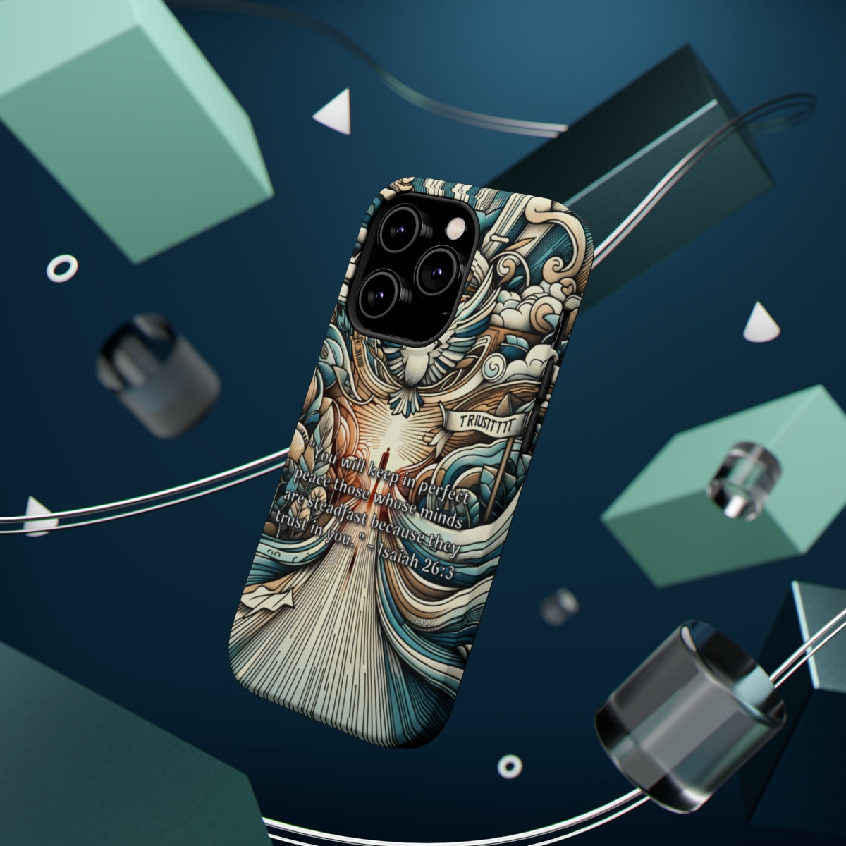 DistinctInk Tough Case for Apple iPhone, Compatible with MagSafe Charging - Peace Through Steadfast Trust: Isaiah 26:3