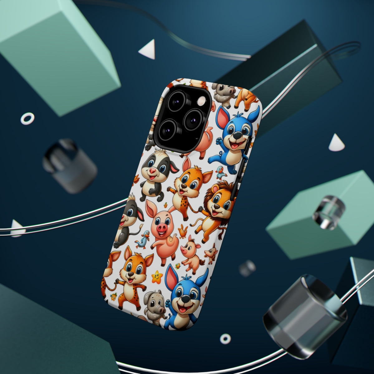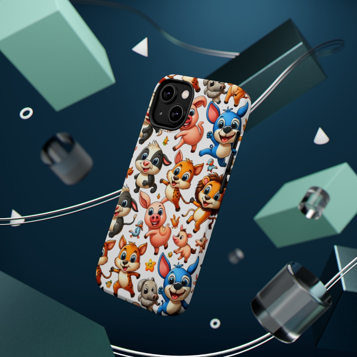 DistinctInk Tough Case for Apple iPhone, Compatible with MagSafe Charging - "Playful Delights: A Cartoon Animal Medley"