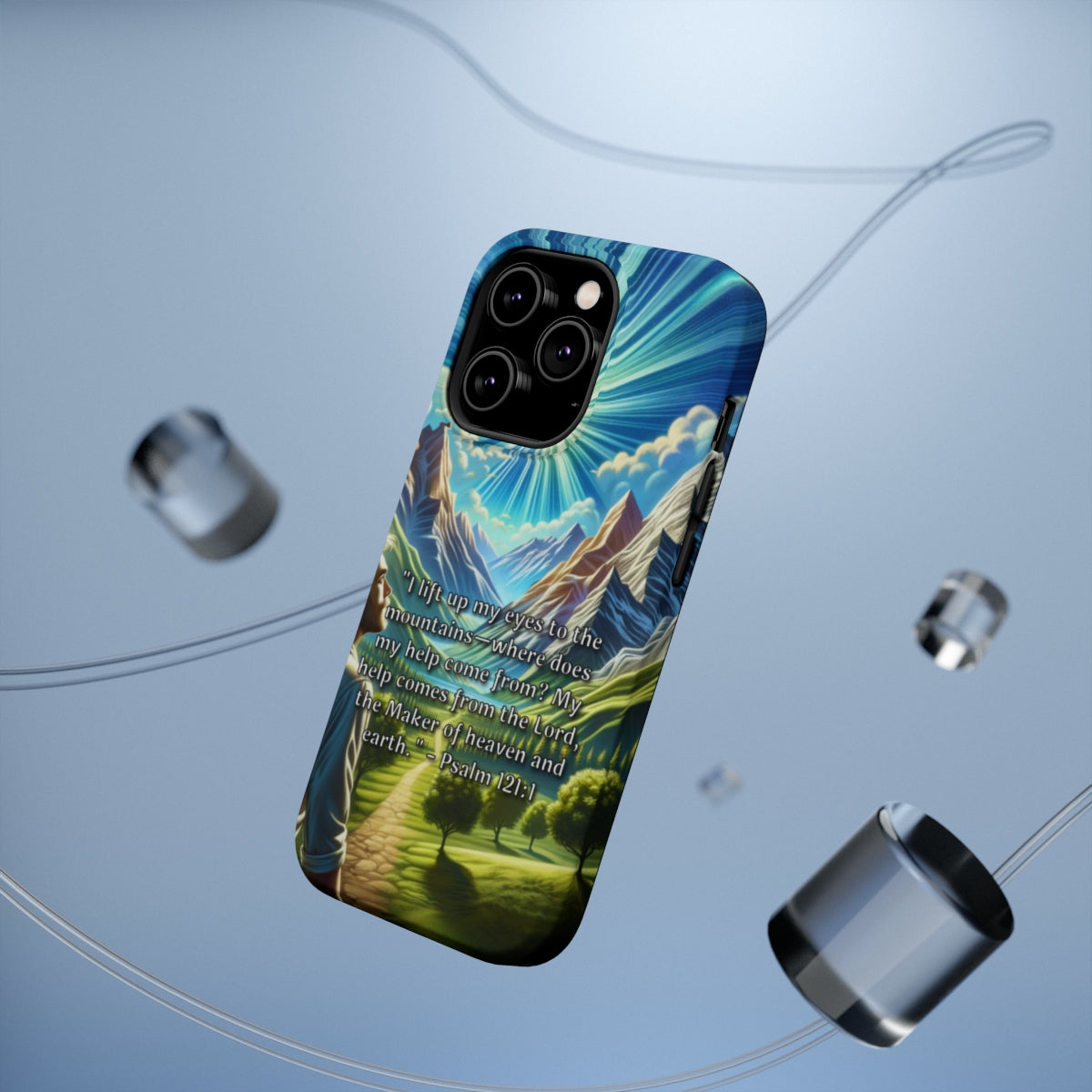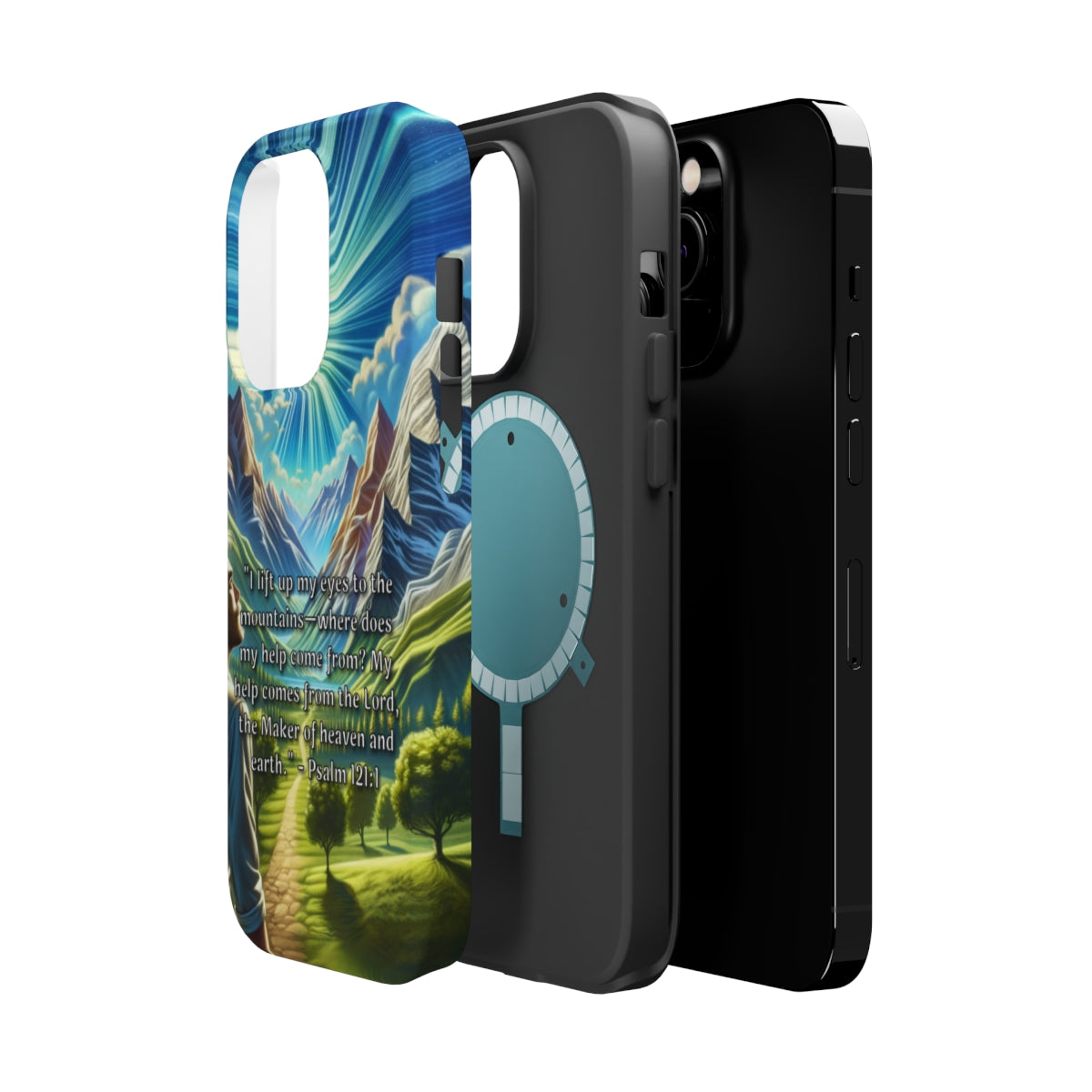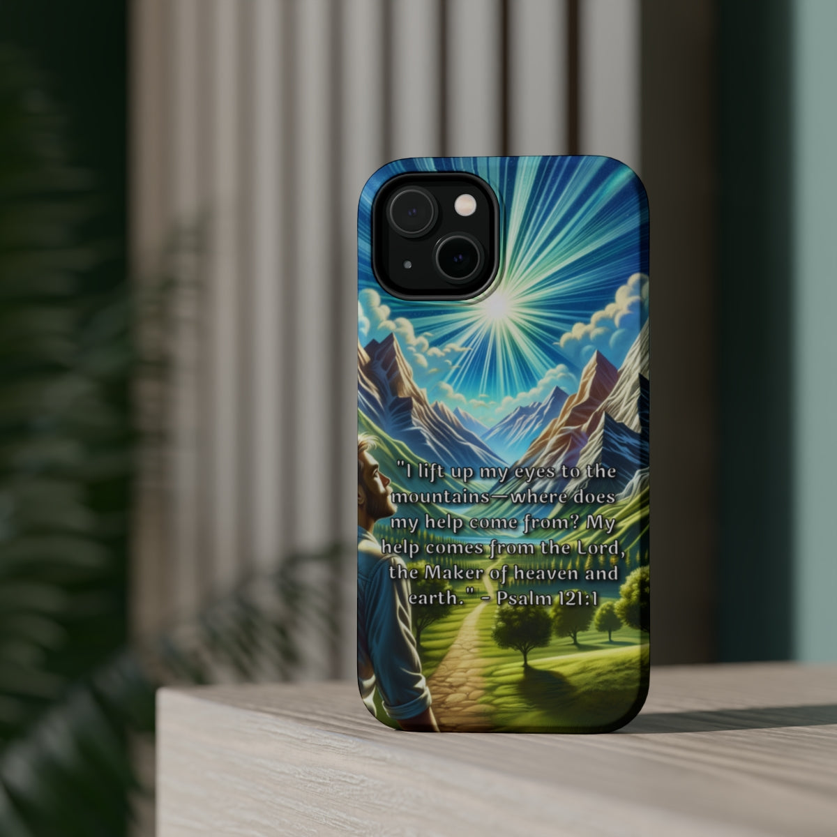 DistinctInk Tough Case for Apple iPhone, Compatible with MagSafe Charging - Psalm 121:1 - Seeking Divine Help from the Mountains