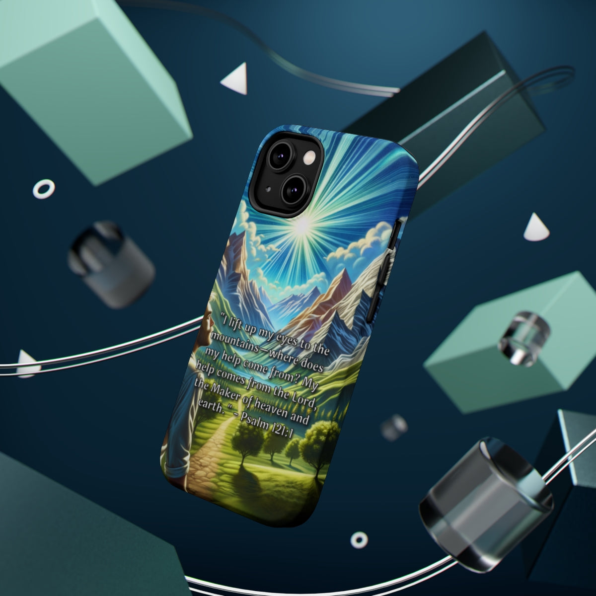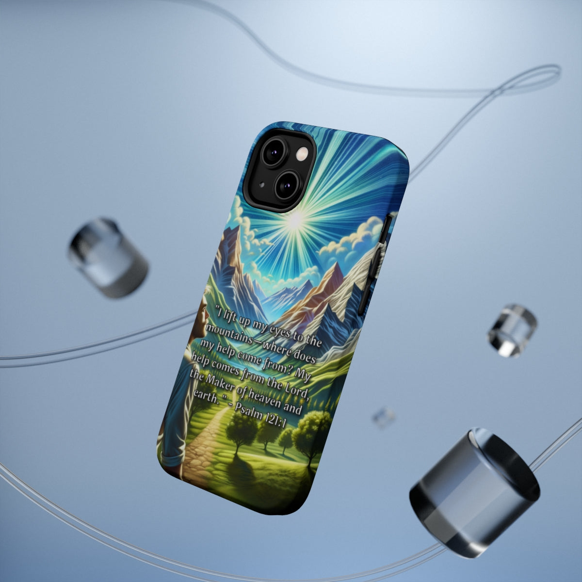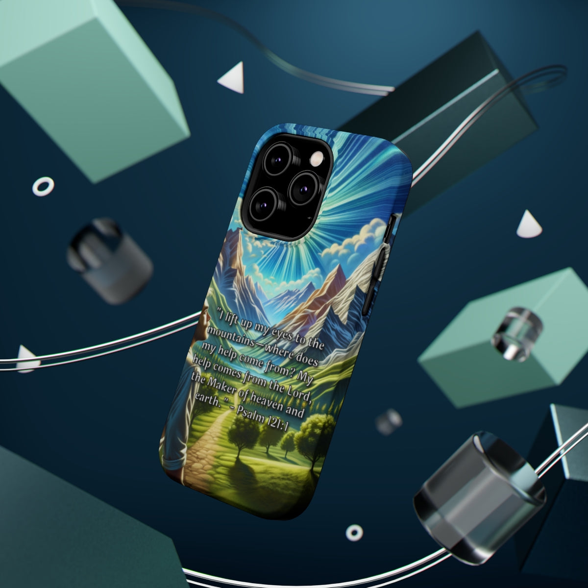 DistinctInk Tough Case for Apple iPhone, Compatible with MagSafe Charging - Psalm 121:1 - Seeking Divine Help from the Mountains