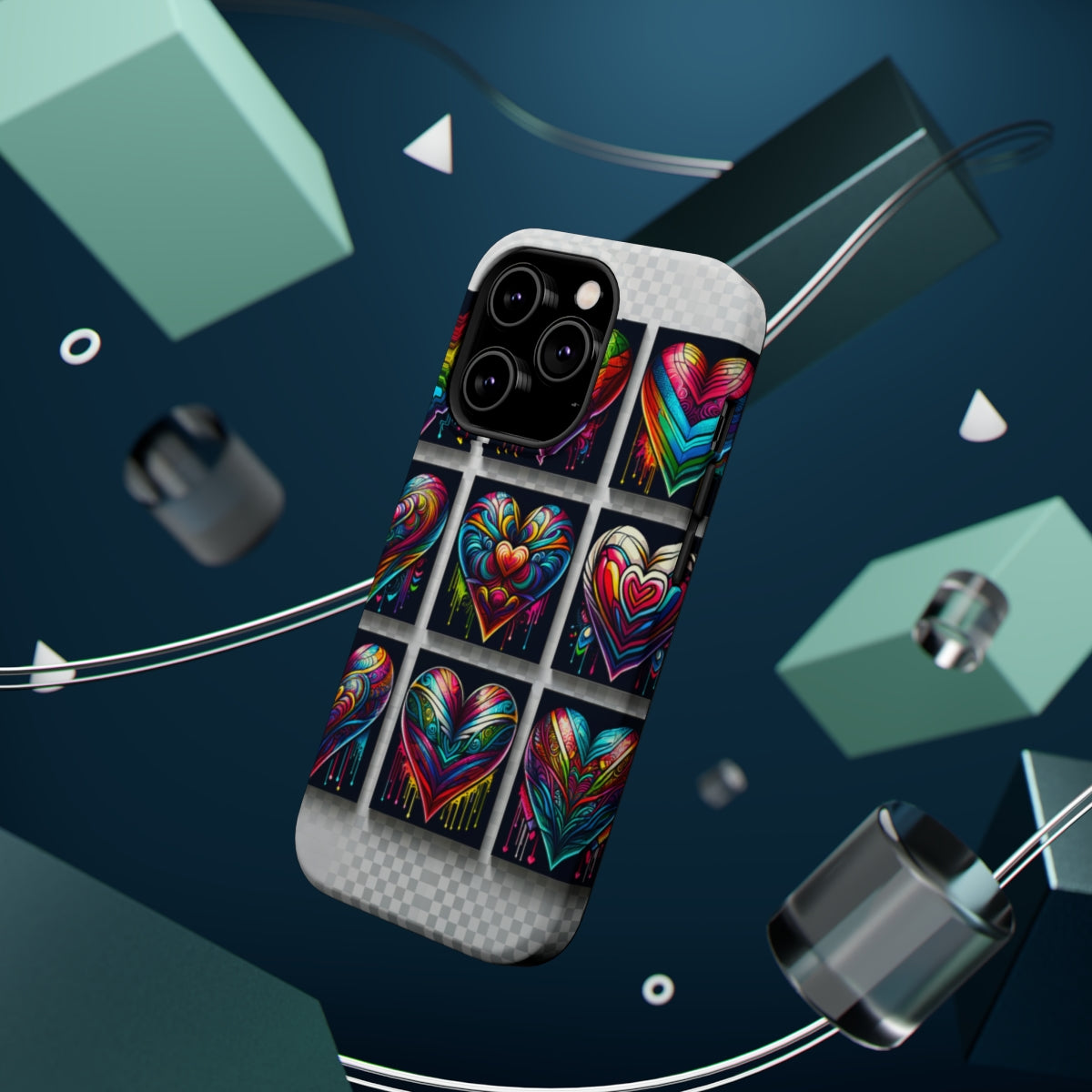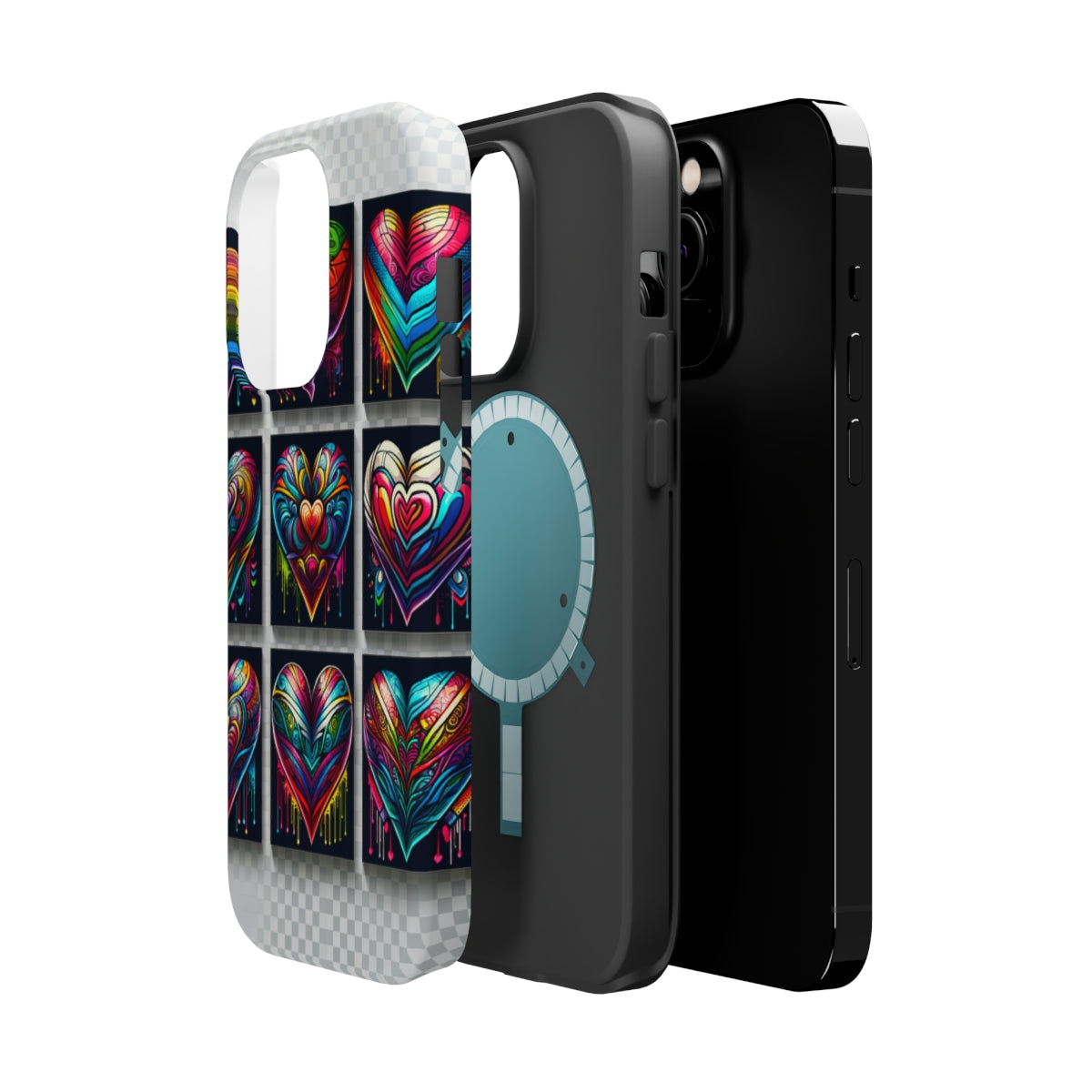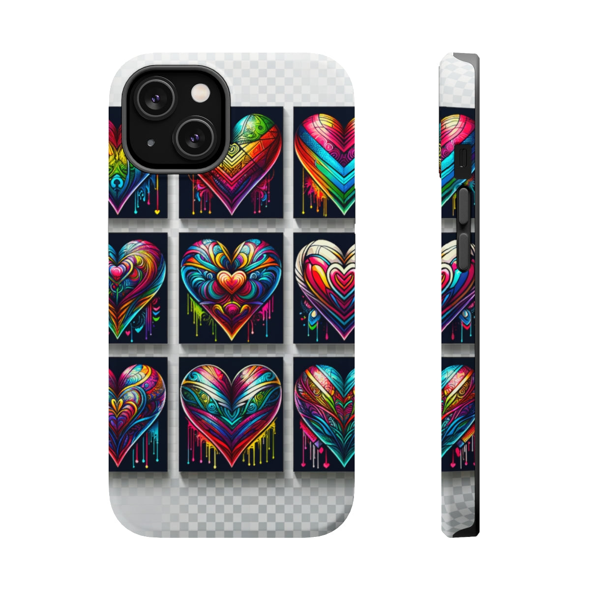 DistinctInk Tough Case for Apple iPhone, Compatible with MagSafe Charging - "Rainbow Prism Hearts: Vibrant and Intricate"