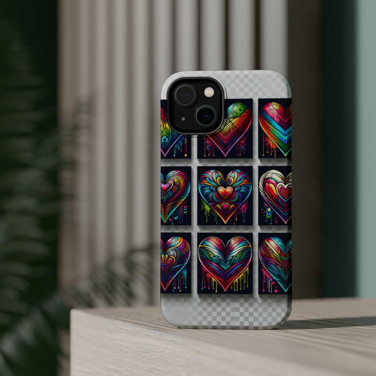 Introducing the DistinctInk ToughCase for Apple iPhone, the ultimate companion for your phone that's compatible with wireless charging! Say goodbye to boring cases and embrace the vibrance and intricacy of our Rainbow Prism Hearts design. 🌈❤️