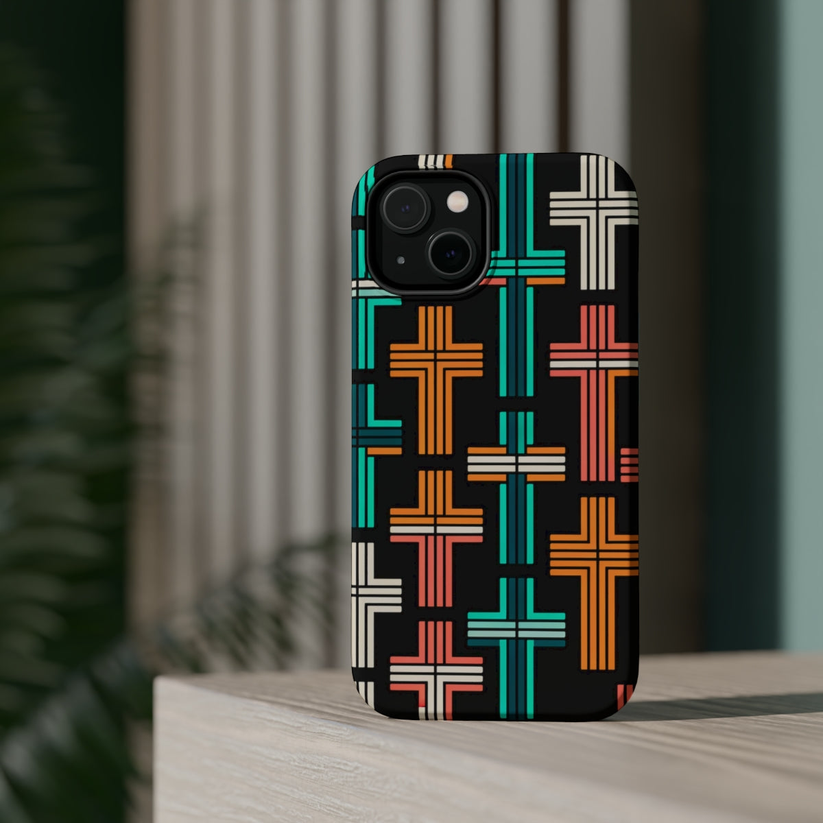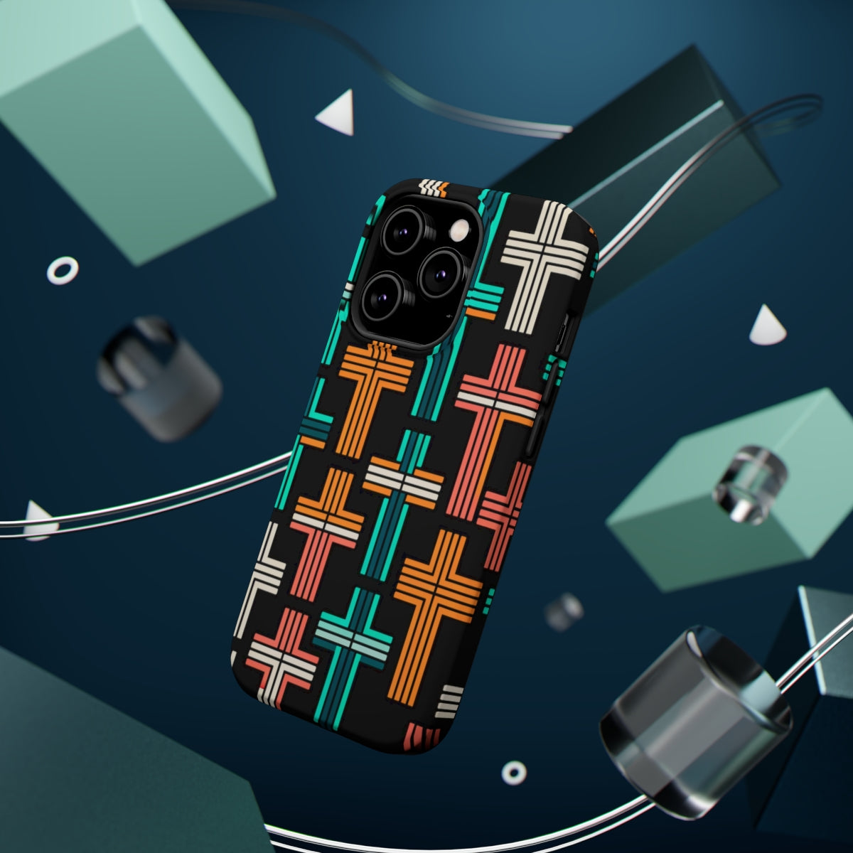 DistinctInk Tough Case for Apple iPhone, Compatible with MagSafe Charging - "Repetitive Vibrant Christian Crosses on Black"