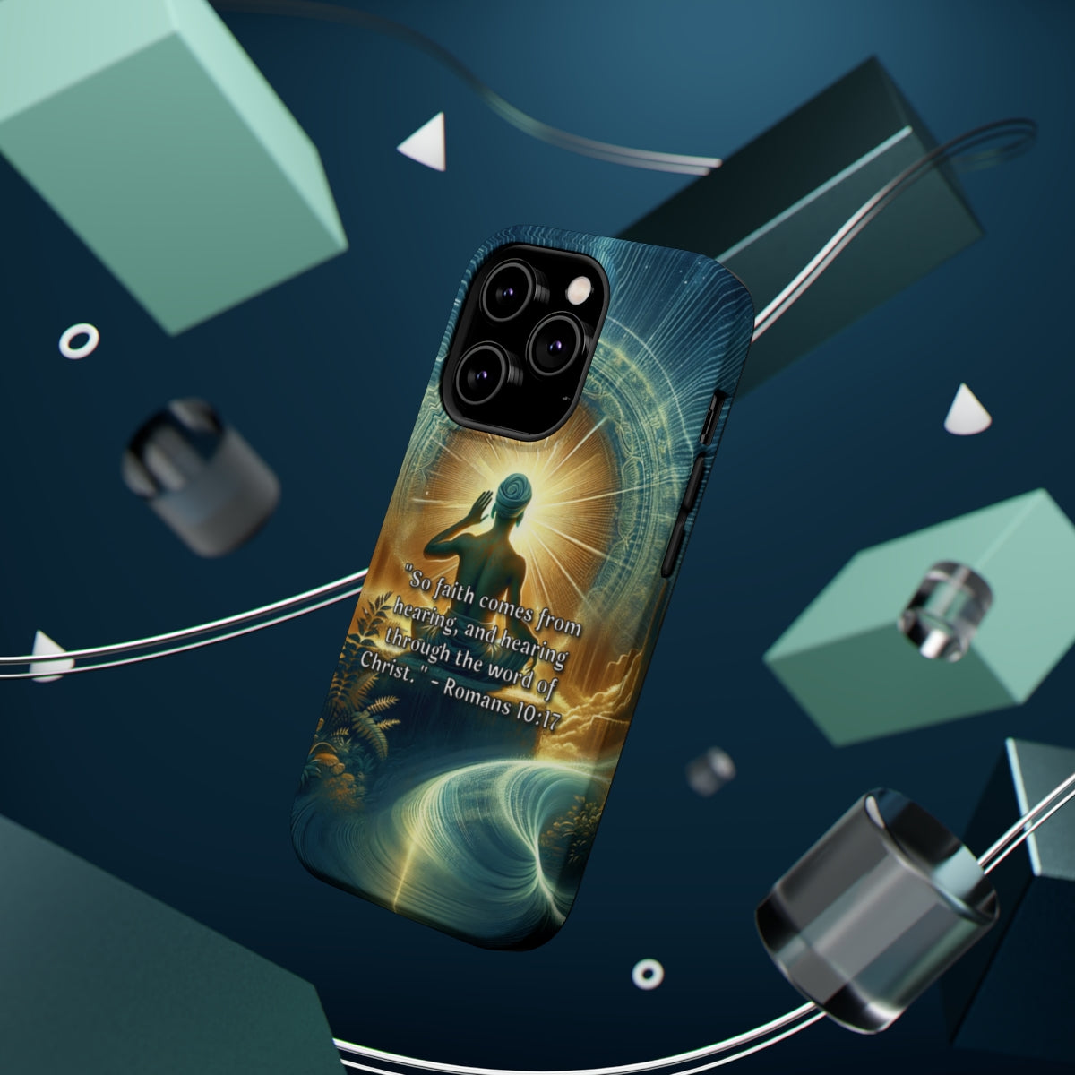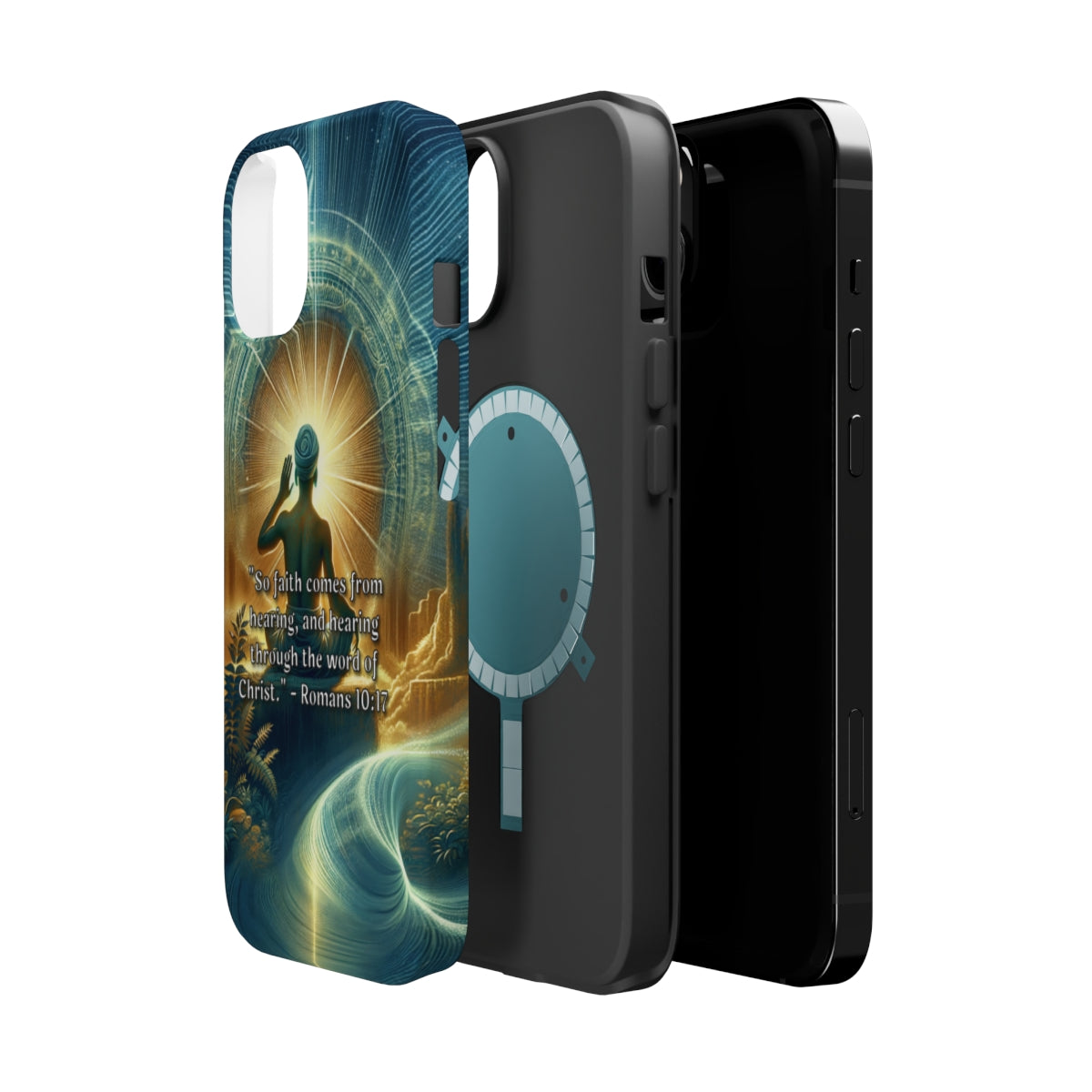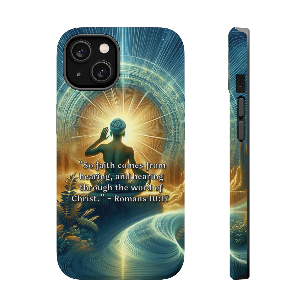 DistinctInk Tough Case for Apple iPhone, Compatible with MagSafe Charging - "Romans 10:17 - Faith through hearing the word of Christ."