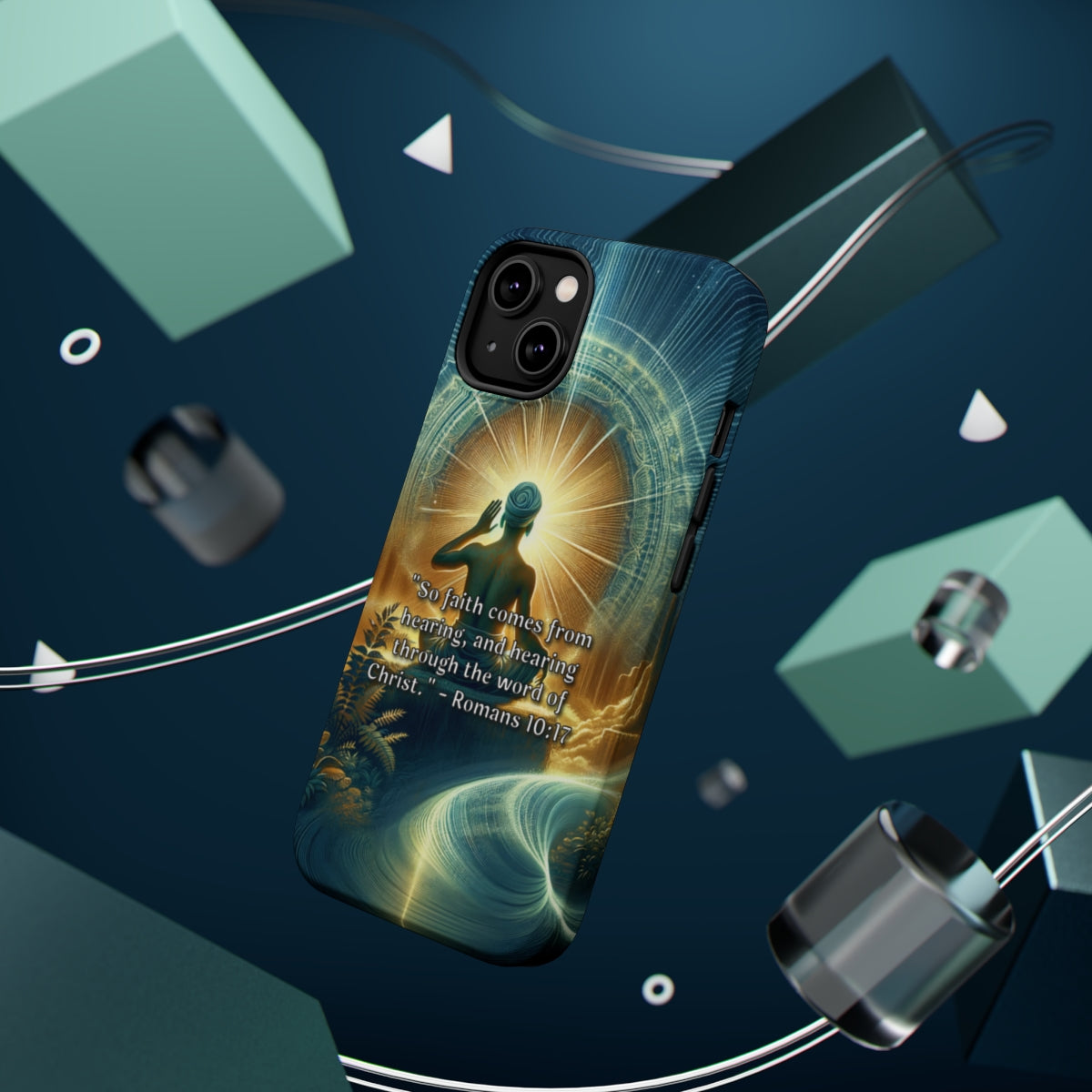 Introducing the DistinctInk ToughCase for Apple iPhone, the ultimate fusion of style and durability! This rugged phone case is not only compatible with Wireless charging but also comes with a dash of divine inspiration. With Romans 10:17 - "Faith through hearing the word of Christ" beautifully printed on the case, you'll have a constant reminder of the power of belief.