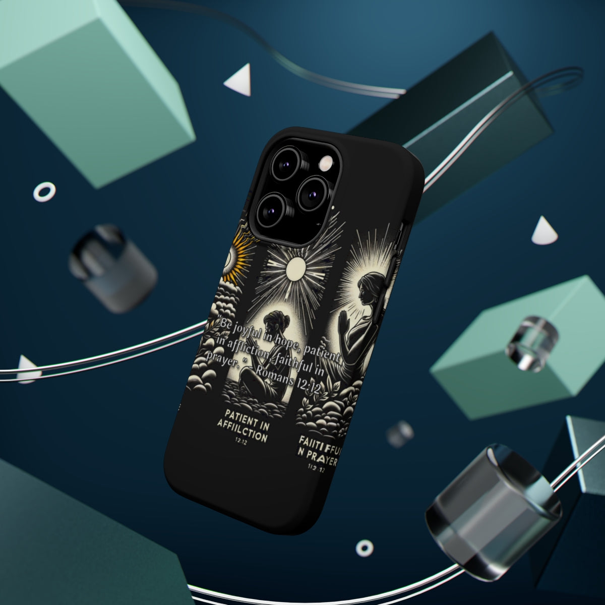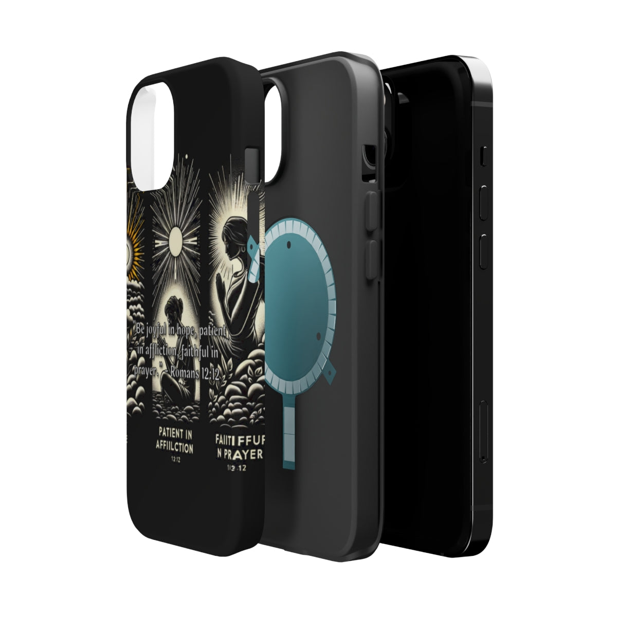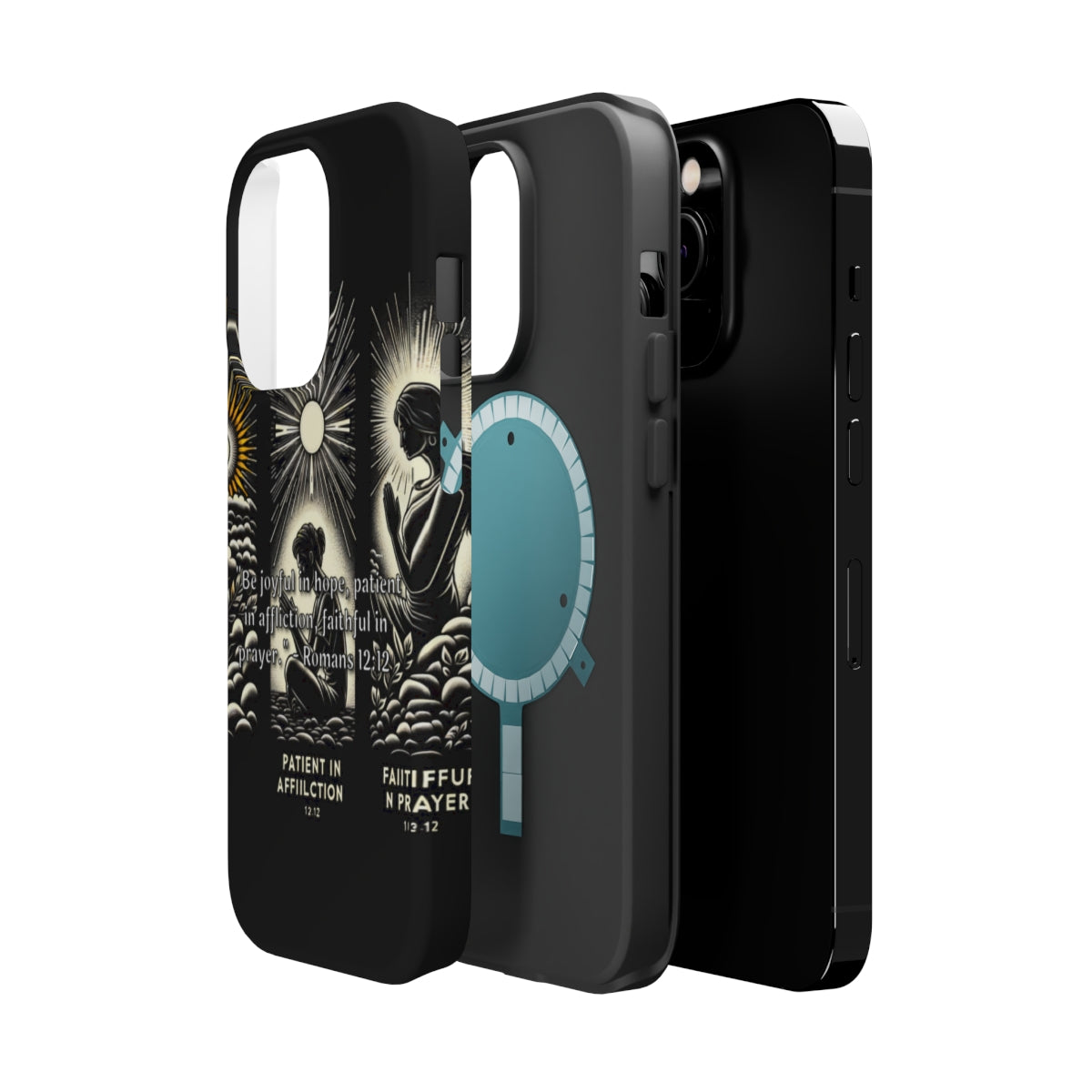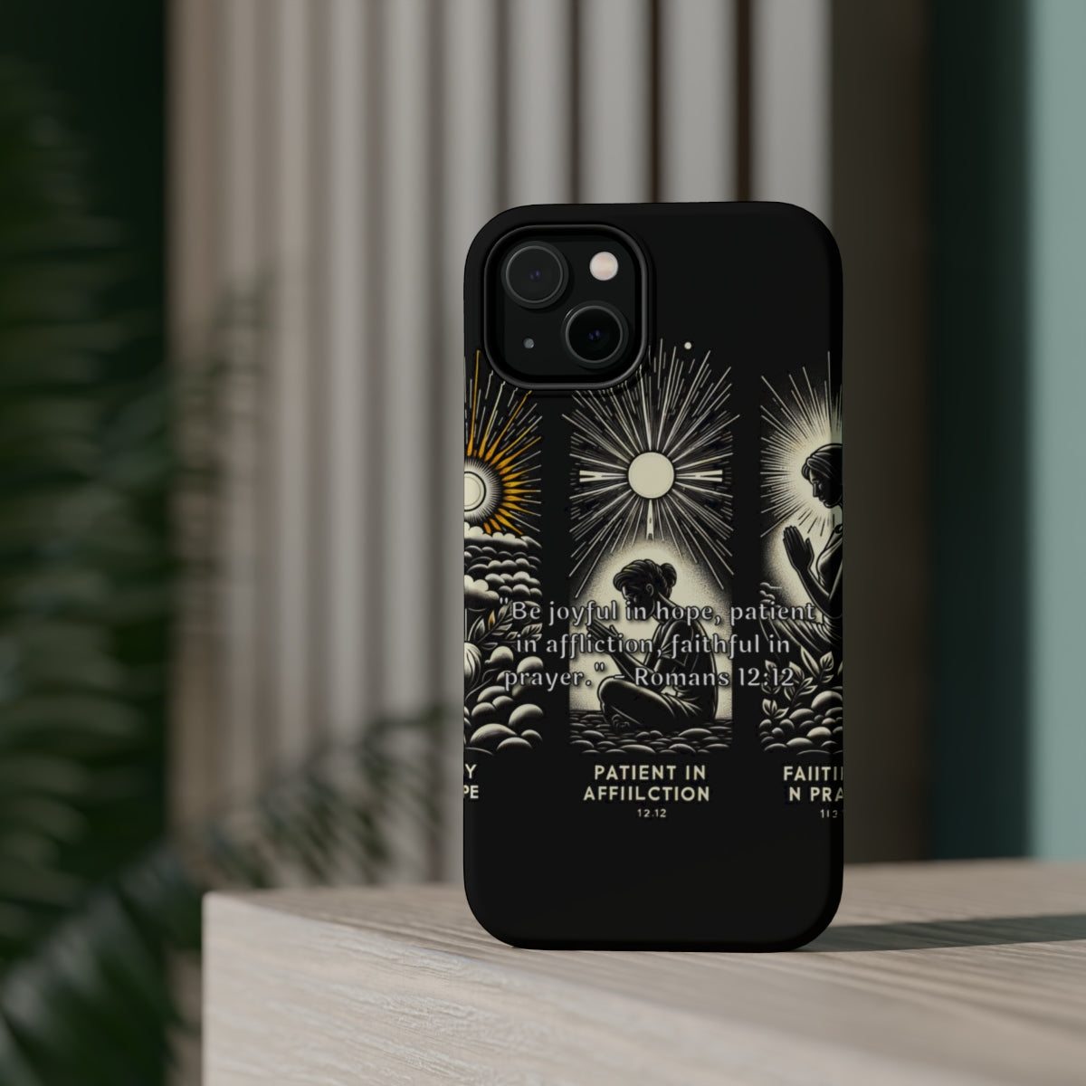 DistinctInk Tough Case for Apple iPhone, Compatible with MagSafe Charging - "Romans 12:12 - Embrace Hope, Endure Affliction, Faithful Prayers"