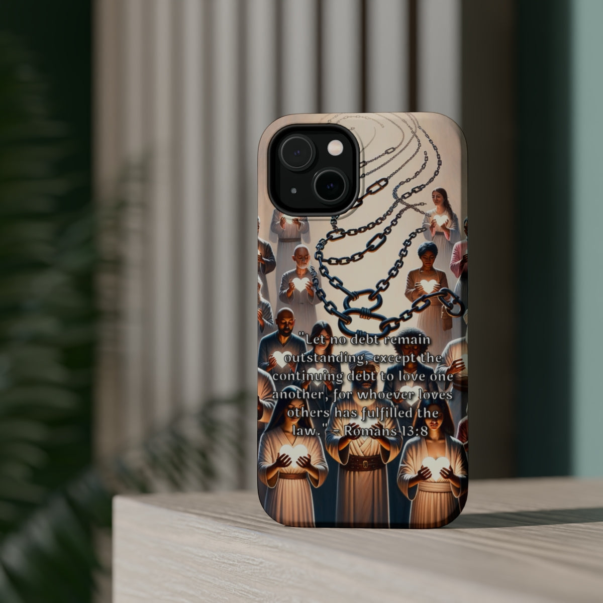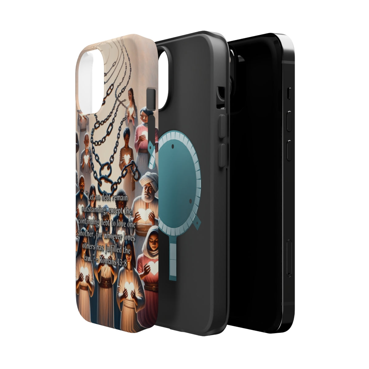 DistinctInk Tough Case for Apple iPhone, Compatible with MagSafe Charging - "Romans 13:8 - Fulfilling the Law through Love"
