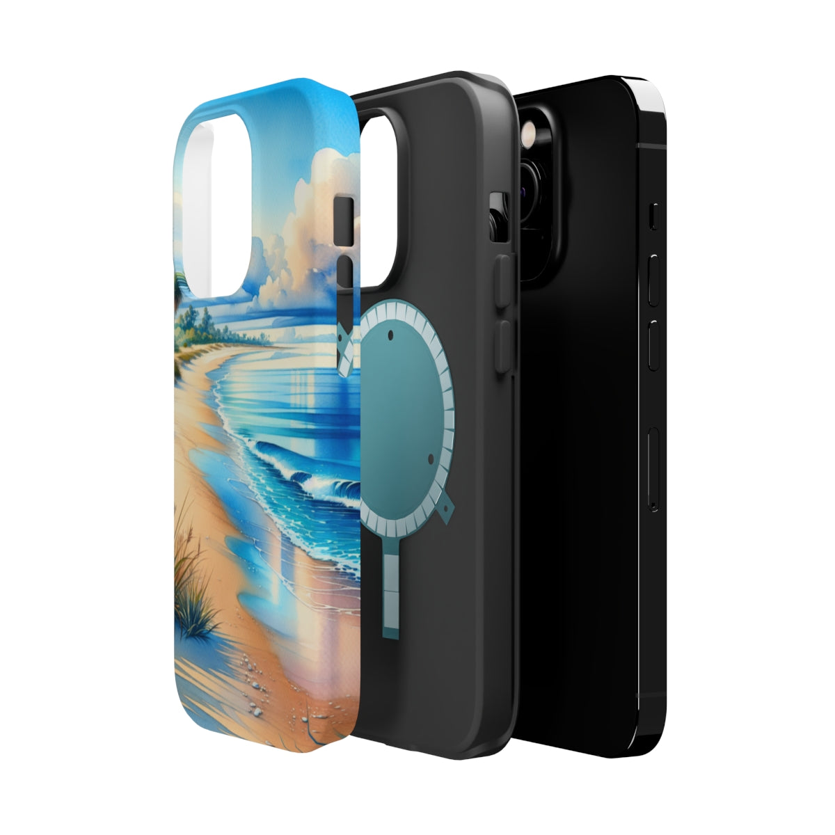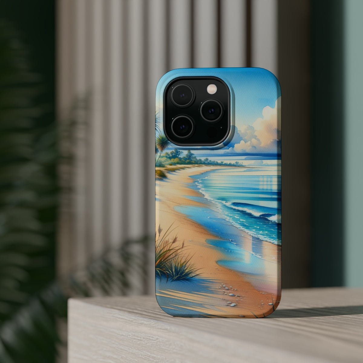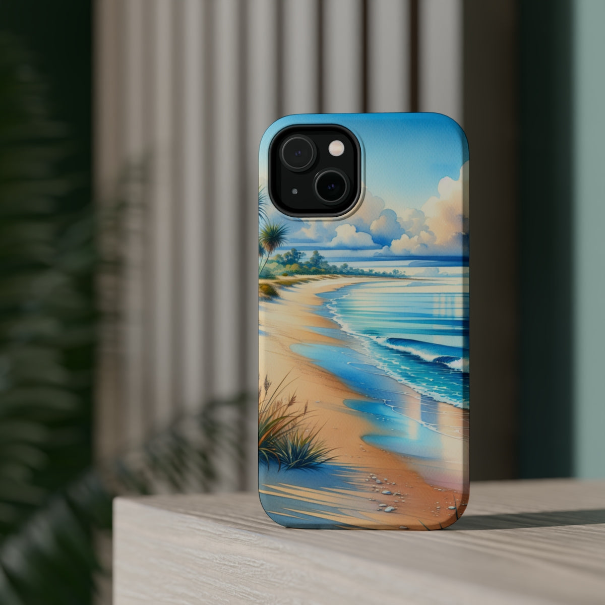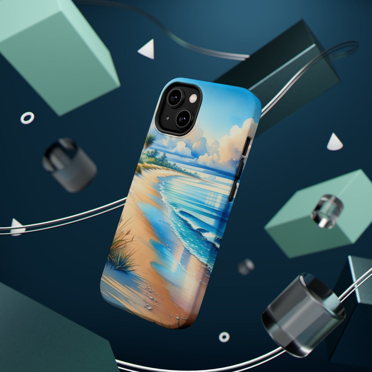 DistinctInk Tough Case for Apple iPhone, Compatible with MagSafe Charging - "Serene Beachscape: A Vibrant Watercolor Masterpiece"