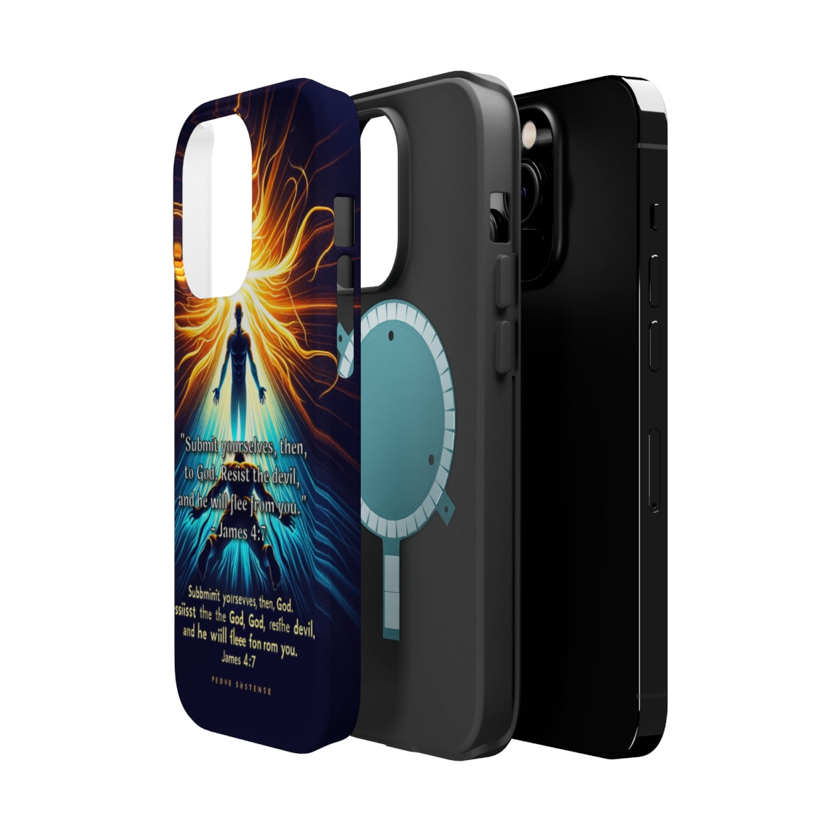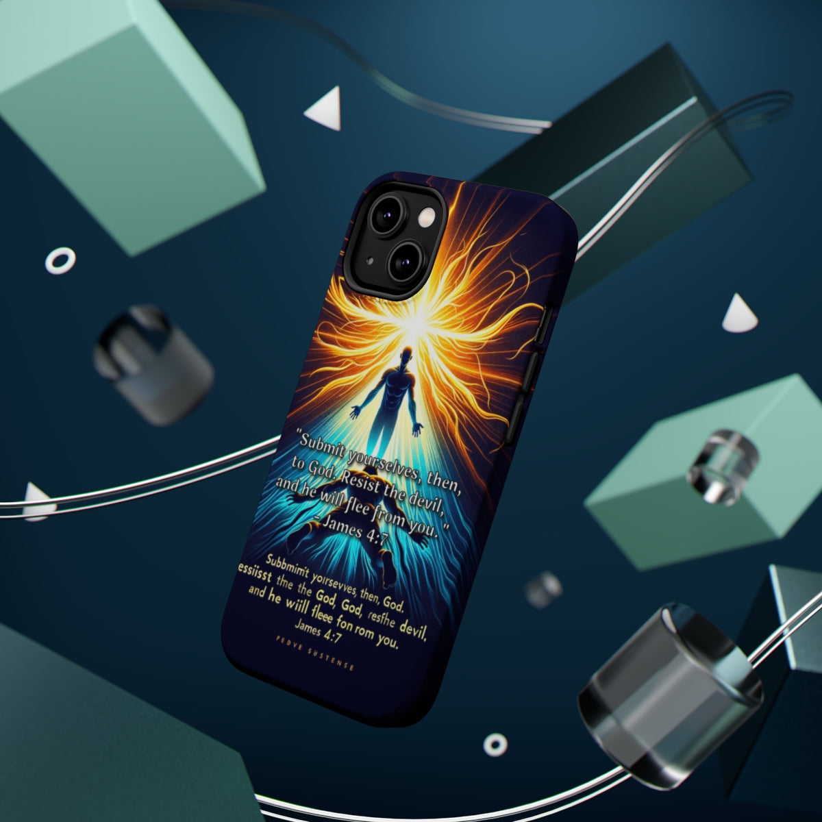 DistinctInk Tough Case for Apple iPhone, Compatible with MagSafe Charging - "Submission to God: James 4:7 - Resisting the Devil"