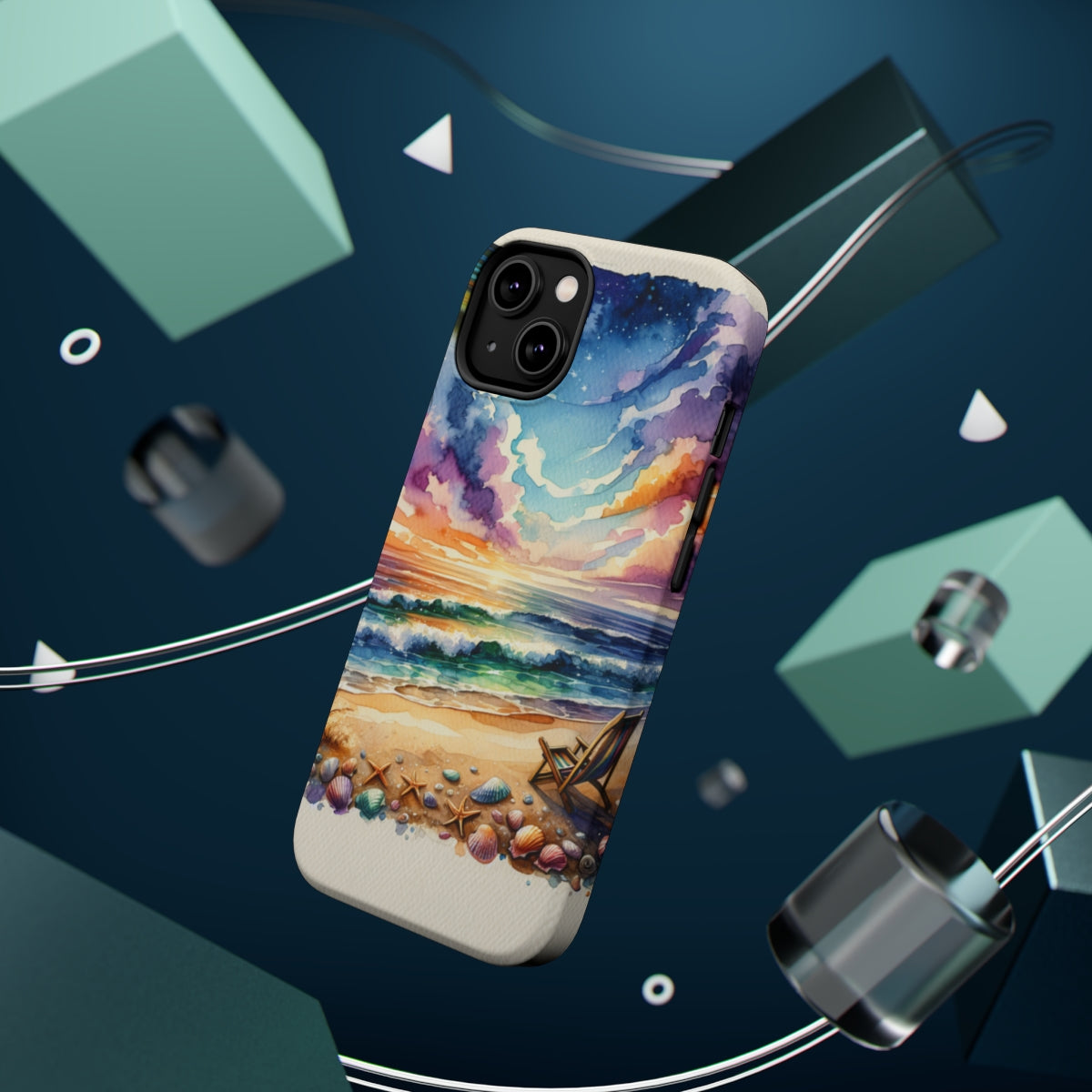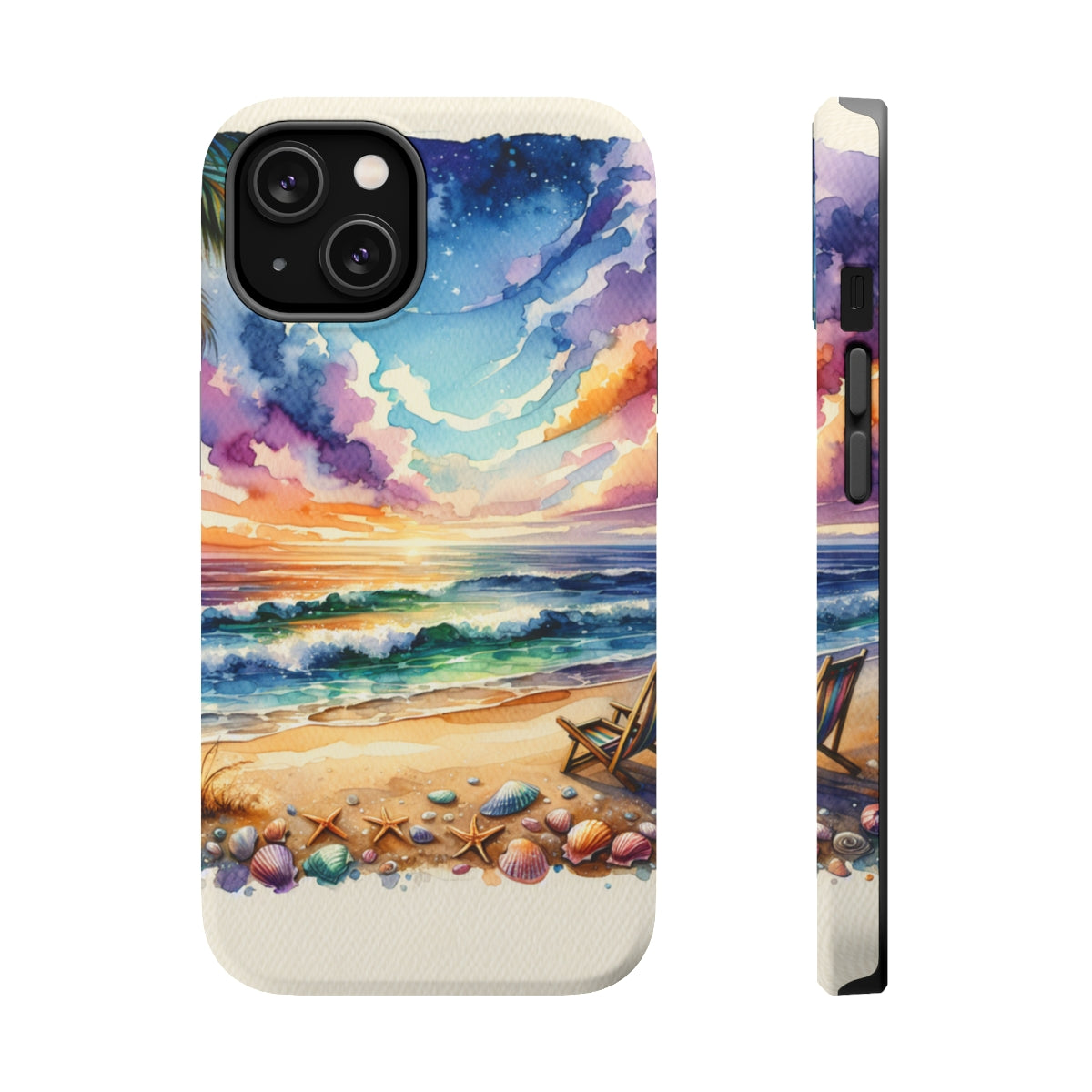 DistinctInk Tough Case for Apple iPhone, Compatible with MagSafe Charging - "Tranquil Sunset Beach with Palm Tree"