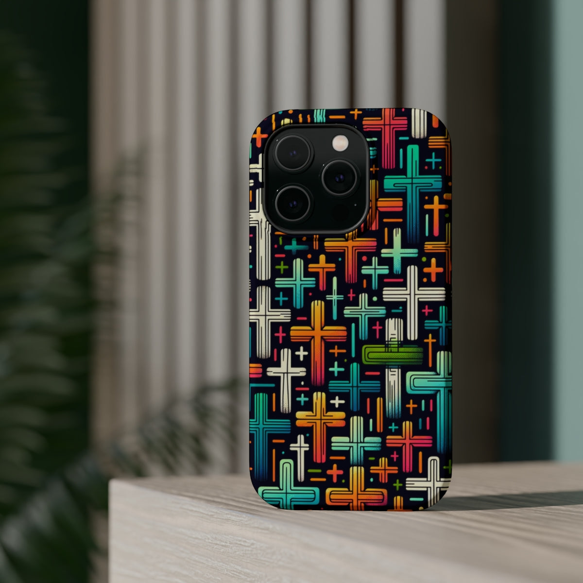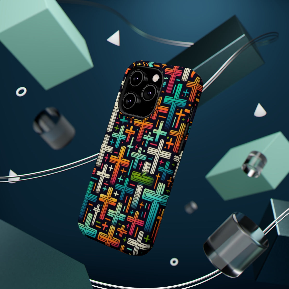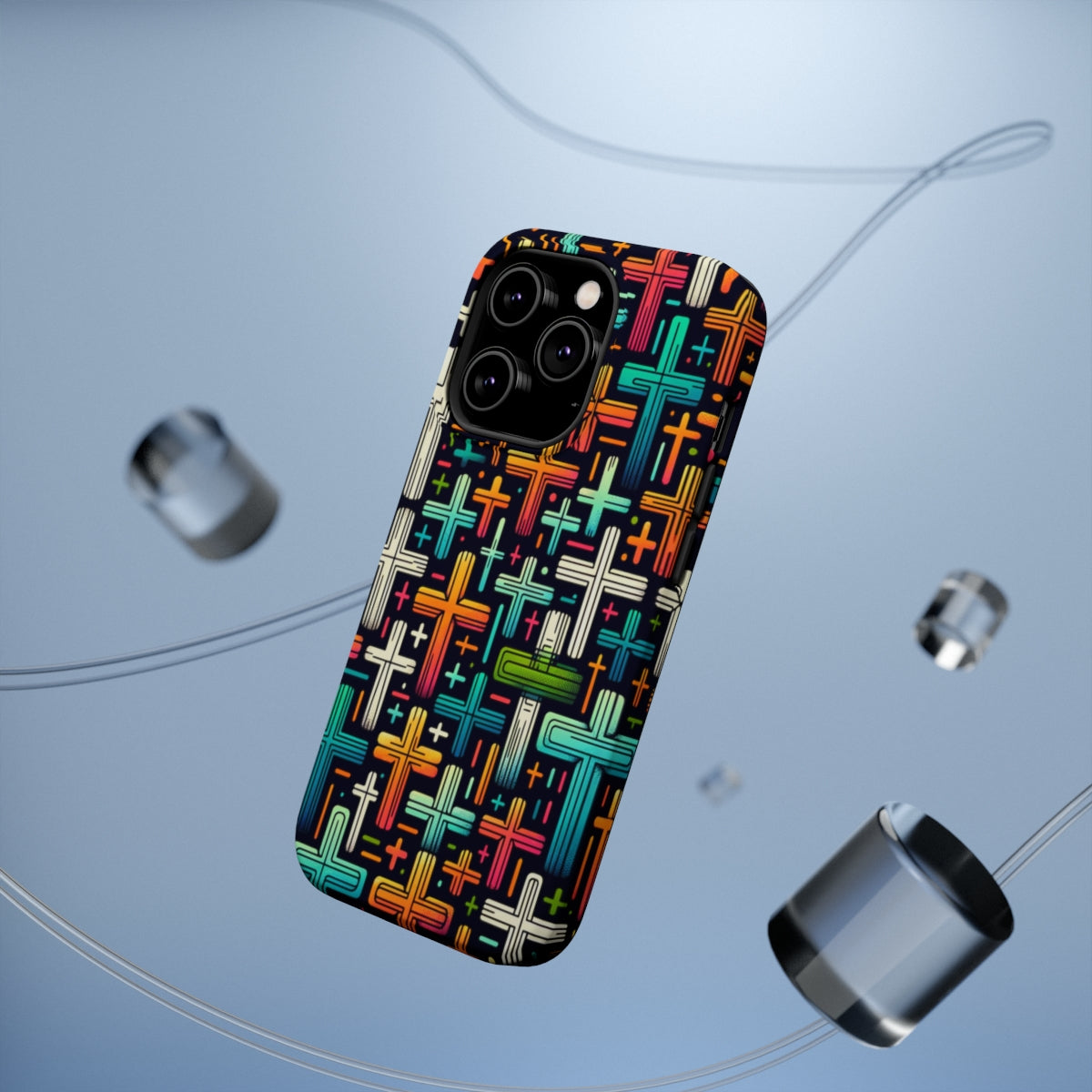 DistinctInk Tough Case for Apple iPhone, Compatible with MagSafe Charging - "Vibrant Cartoon Crosses on Dark Background"