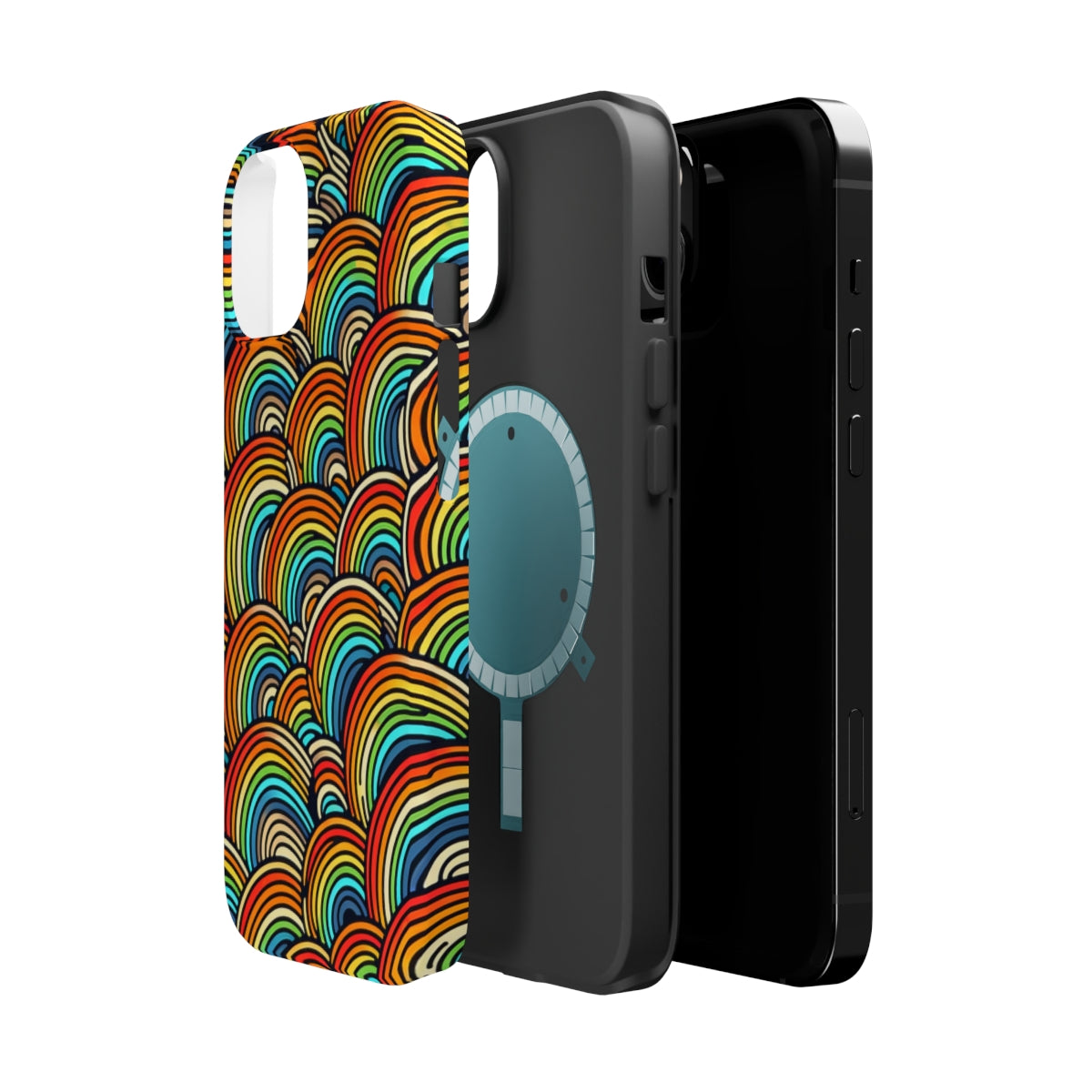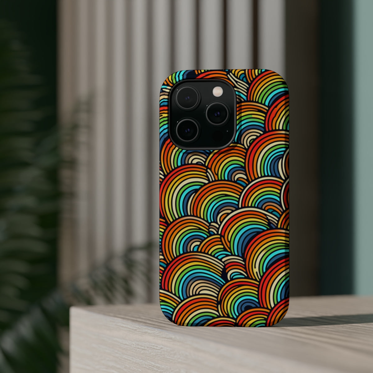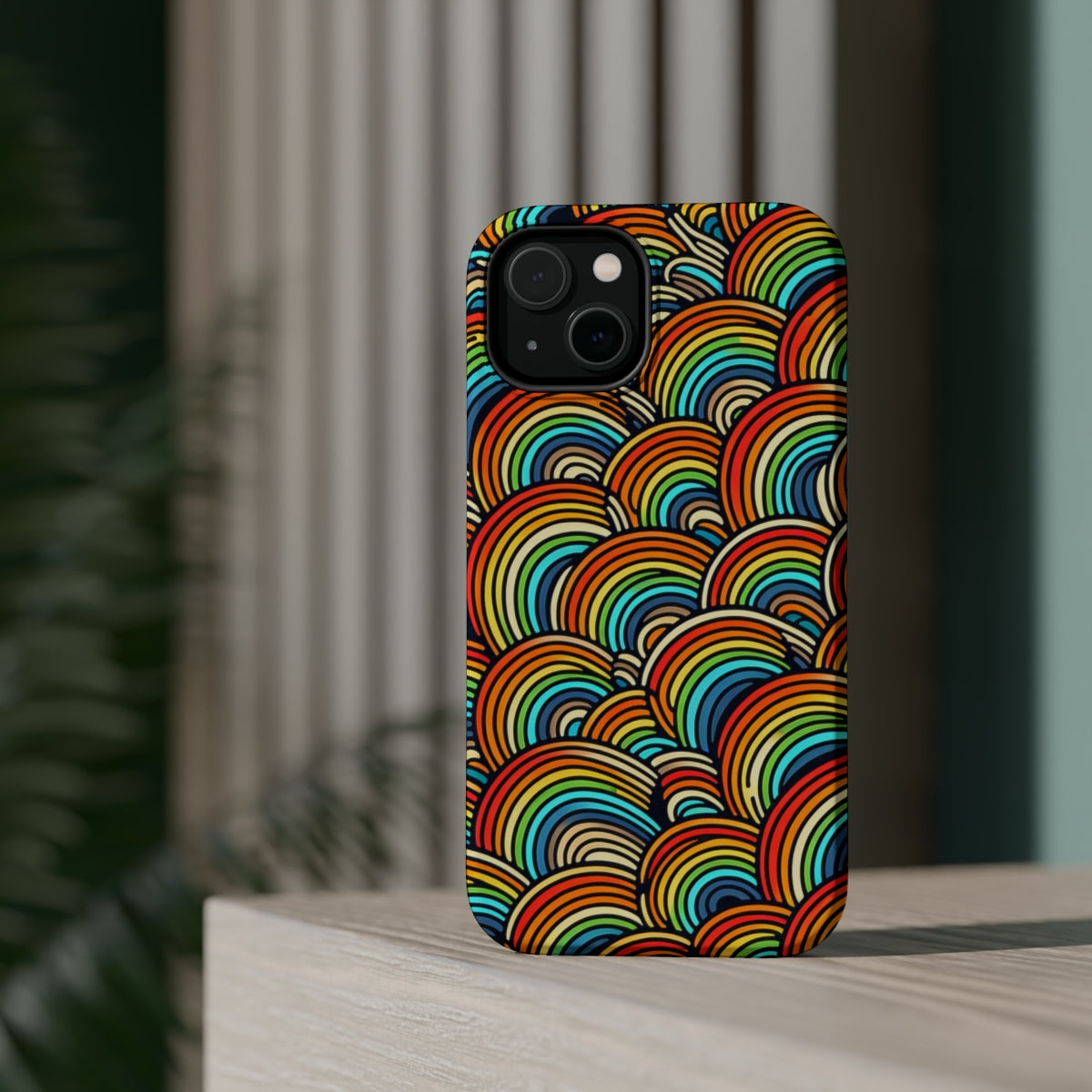 DistinctInk Tough Case for Apple iPhone, Compatible with MagSafe Charging - "Vibrant Cartoon Rainbows on Black Canvas"