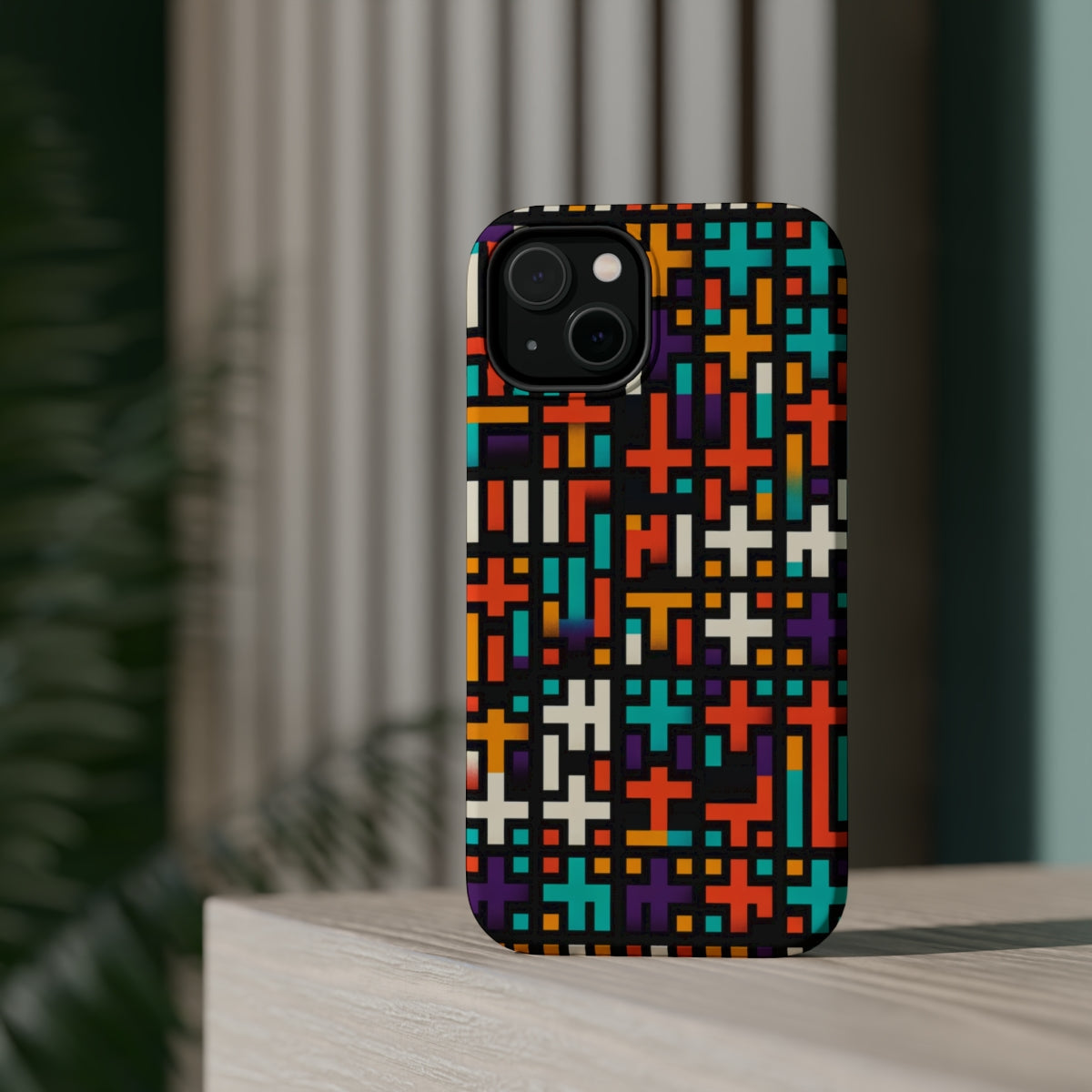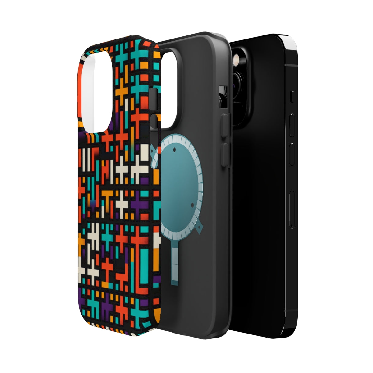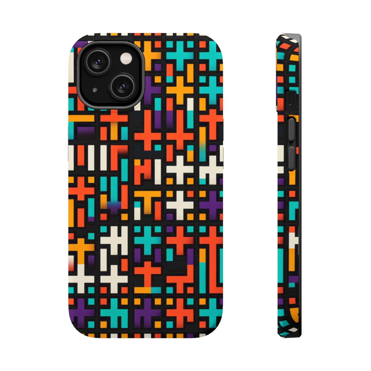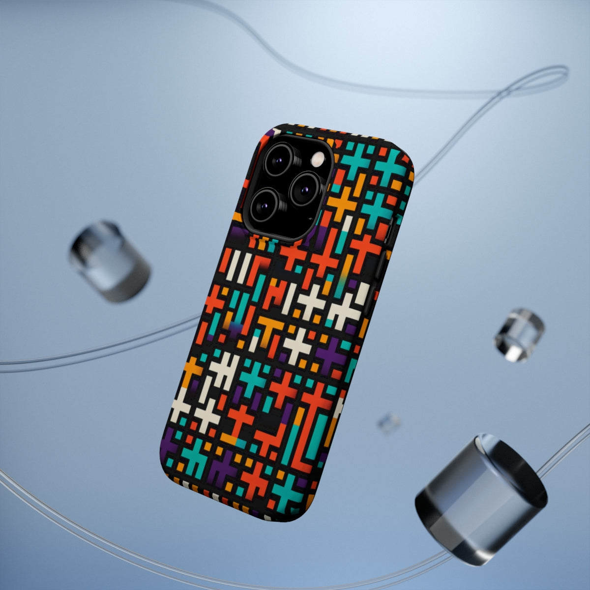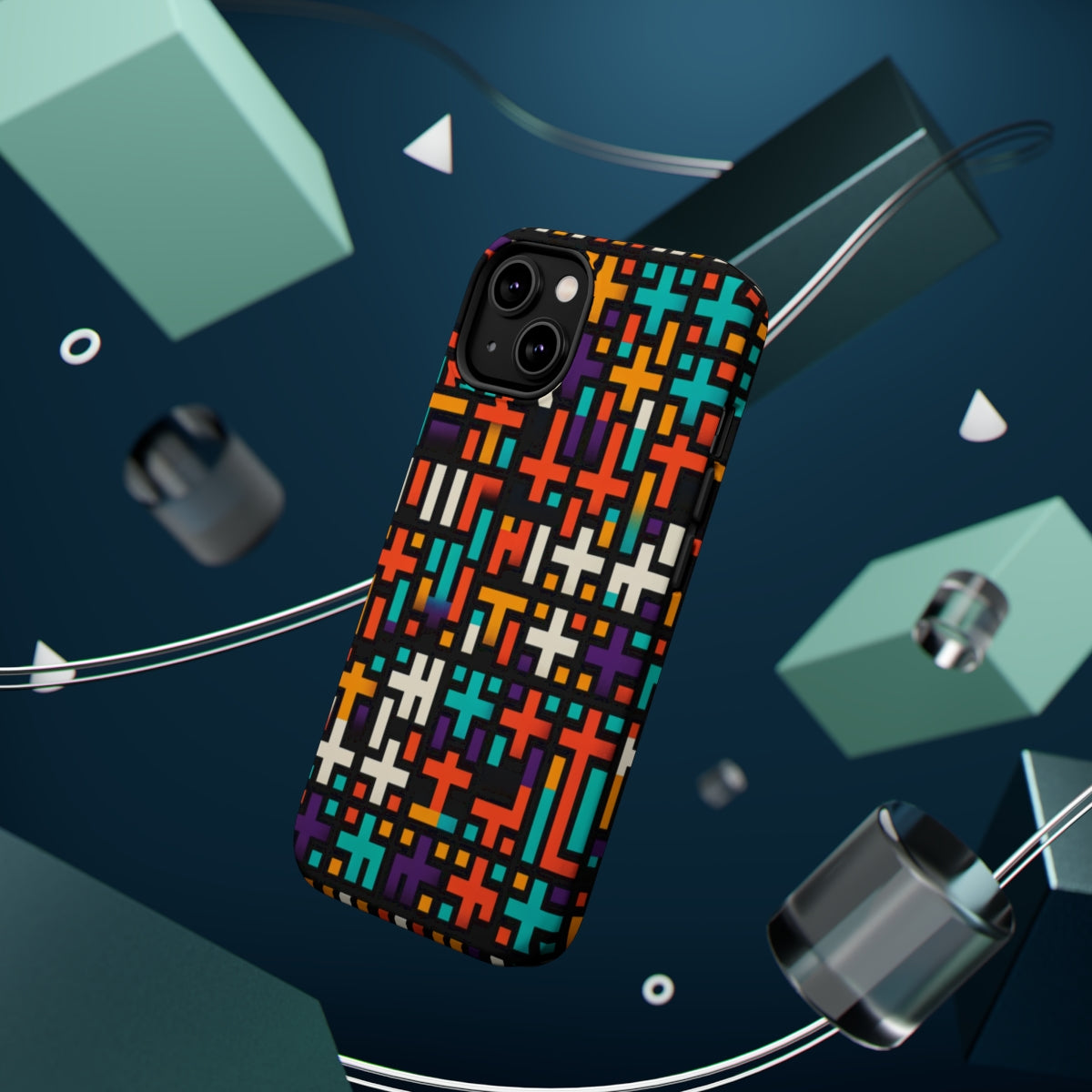DistinctInk Tough Case for Apple iPhone, Compatible with MagSafe Charging - "Vibrant Christian Cross Pattern on Black"
