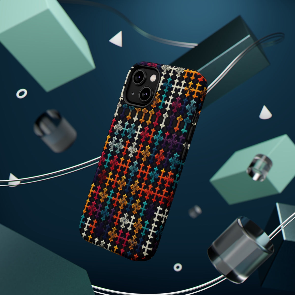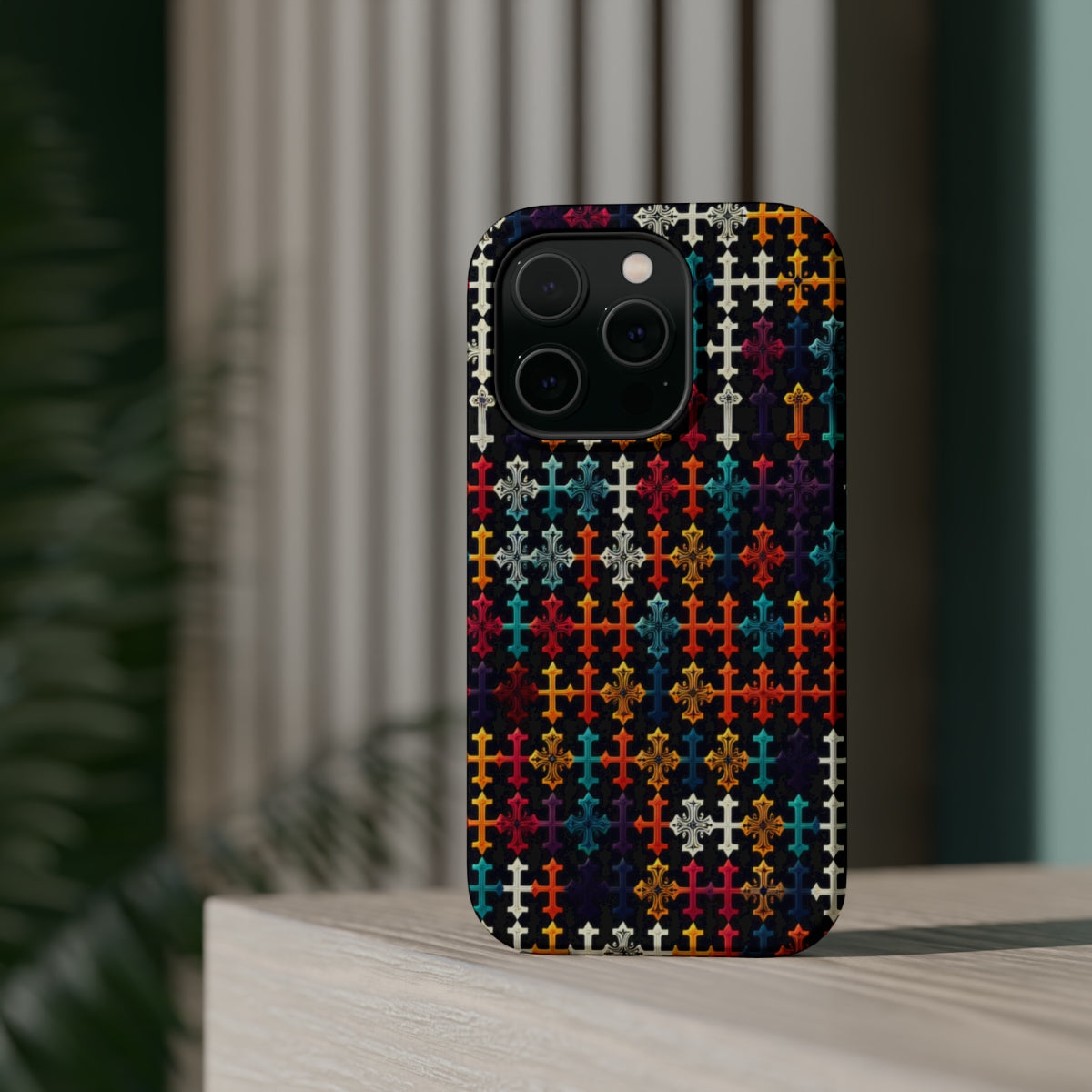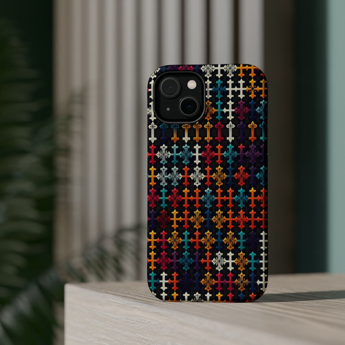 DistinctInk Tough Case for Apple iPhone, Compatible with MagSafe Charging - "Vibrant Christian Crosses in Harmonious Repetition"