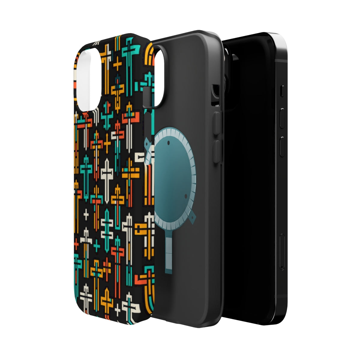 DistinctInk Tough Case for Apple iPhone, Compatible with MagSafe Charging - Vibrant Christian Crosses on Black Background