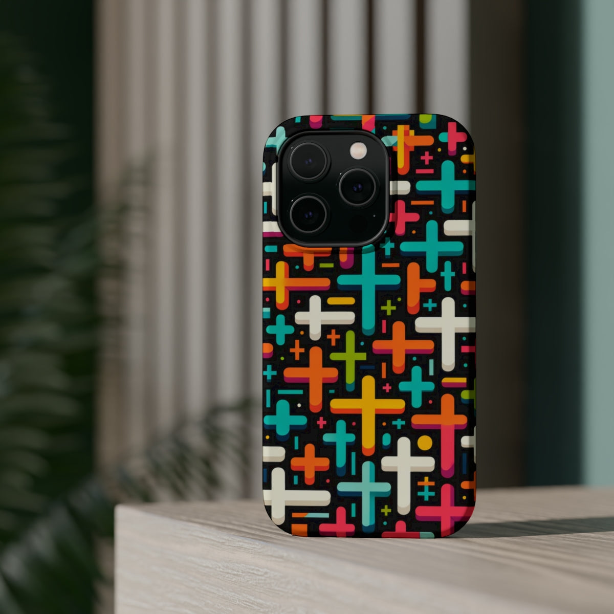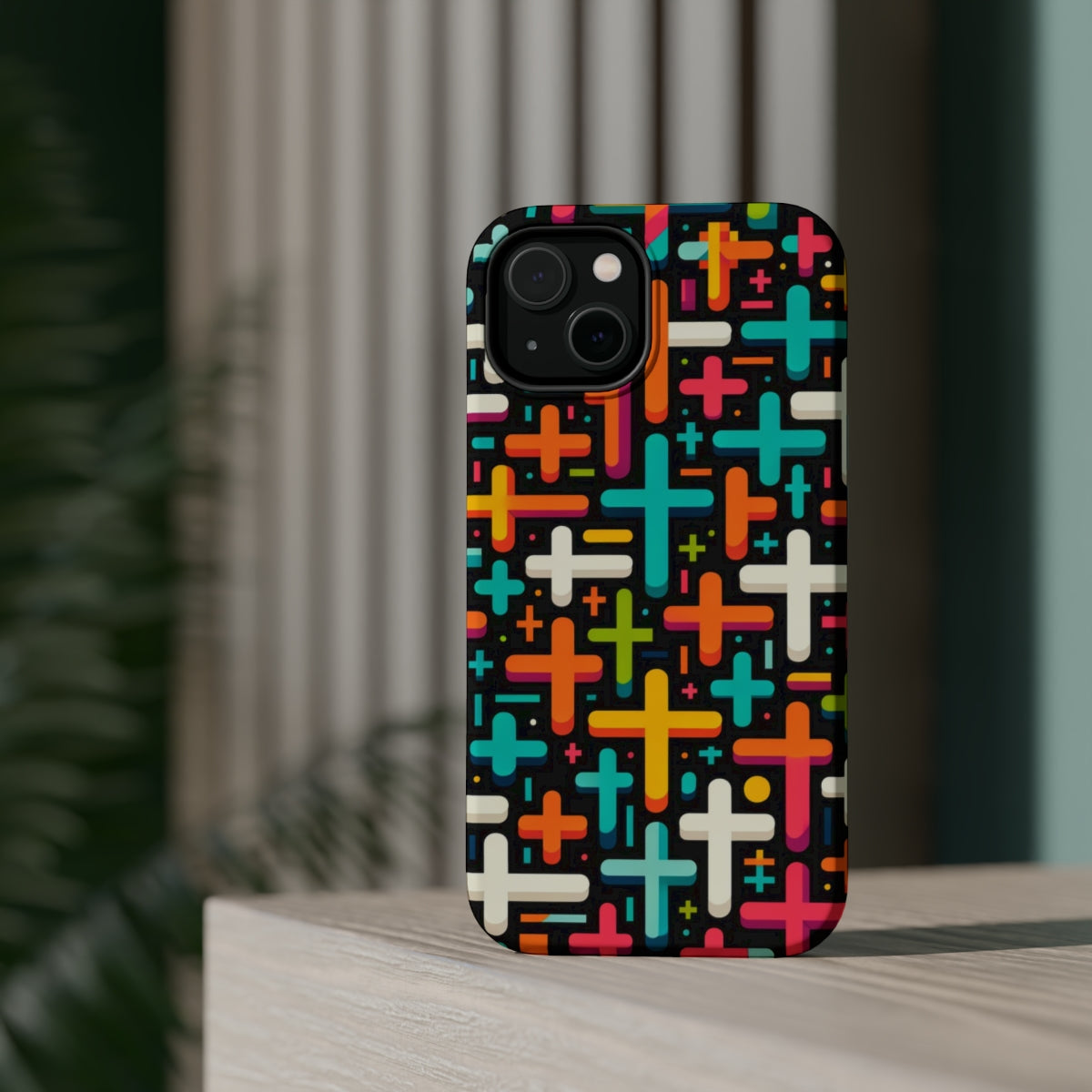 DistinctInk Tough Case for Apple iPhone, Compatible with MagSafe Charging - Vibrant Christian Crosses on Bold Black