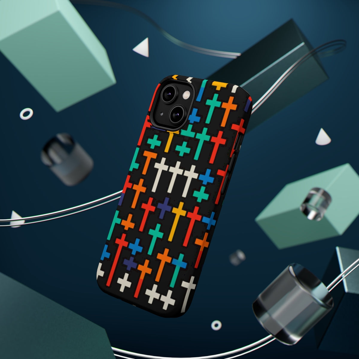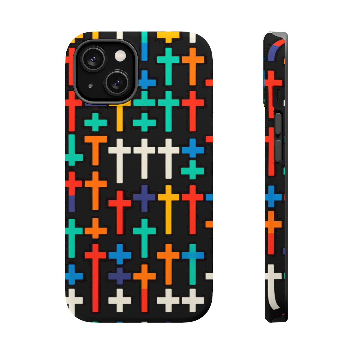 DistinctInk Tough Case for Apple iPhone, Compatible with MagSafe Charging - "Vibrant Crosses on Solid Black: Striking Pattern"