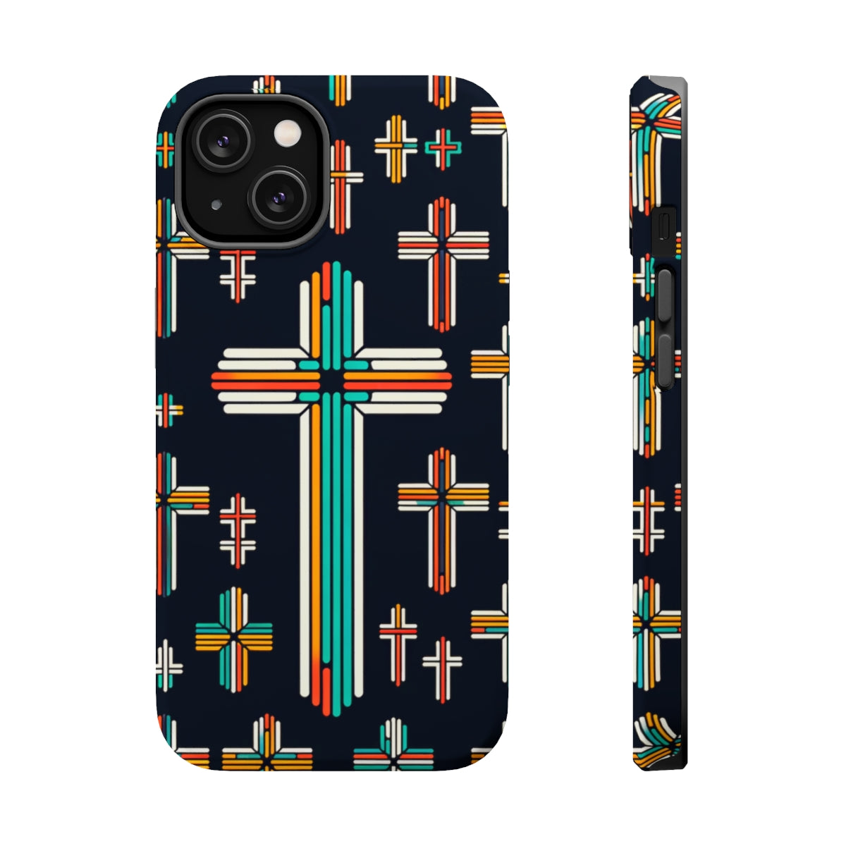 Don't settle for ordinary when you can have extraordinary. Upgrade your phone's protection and style game with the DistinctInk ToughCase for Apple iPhone compatible with wireless charging. Embrace the "Vibrant Crosses" design and