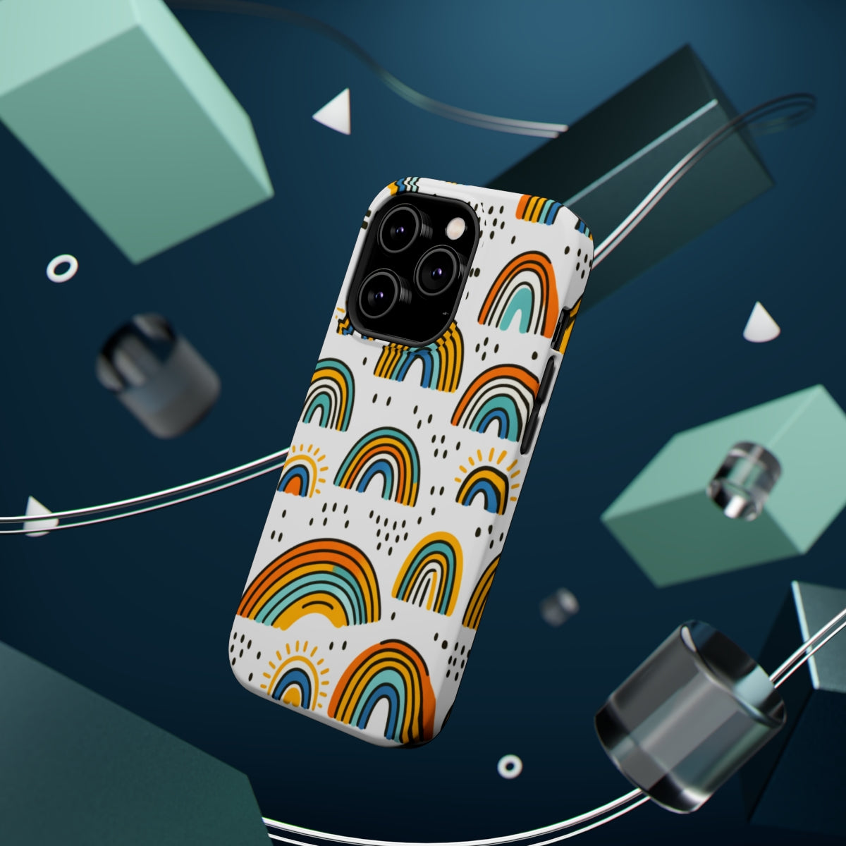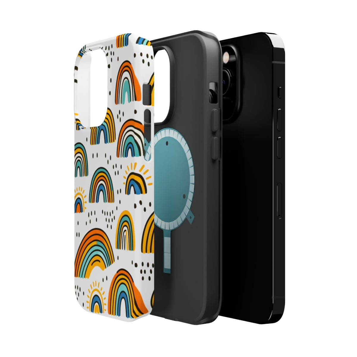 DistinctInk Tough Case for Apple iPhone, Compatible with MagSafe Charging - Vibrant Hand-drawn Cartoon Rainbows on White