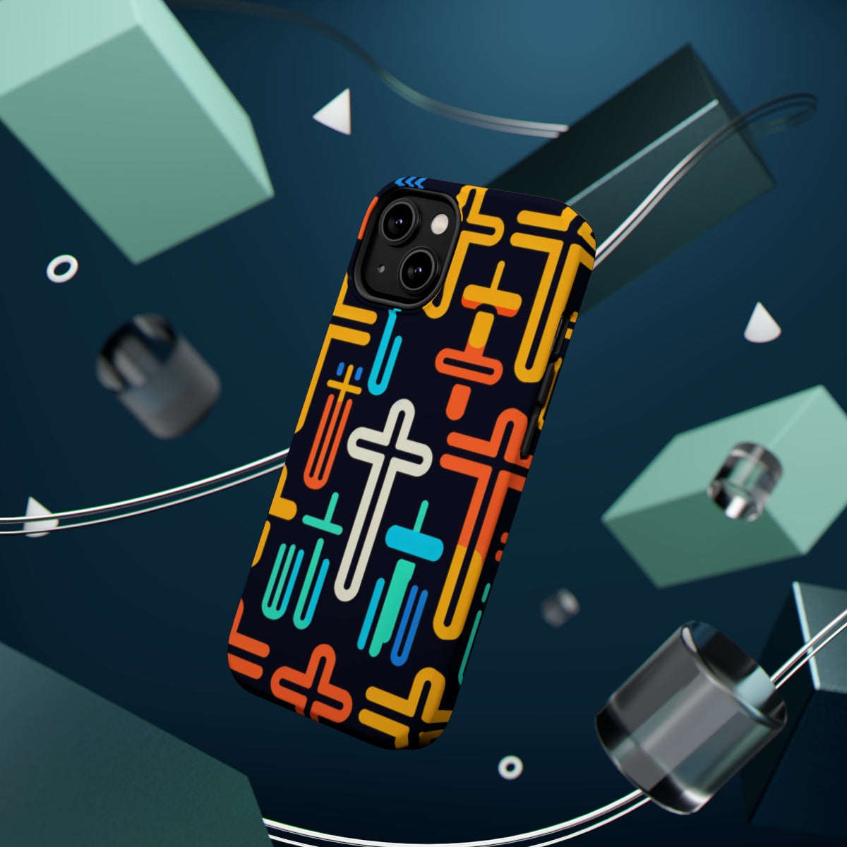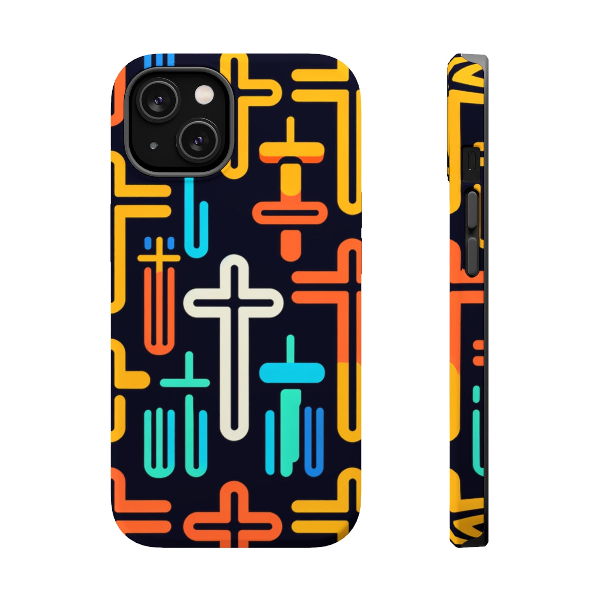 DistinctInk Tough Case for Apple iPhone, Compatible with MagSafe Charging - "Vibrant Minimalistic Christian Crosses on Black"