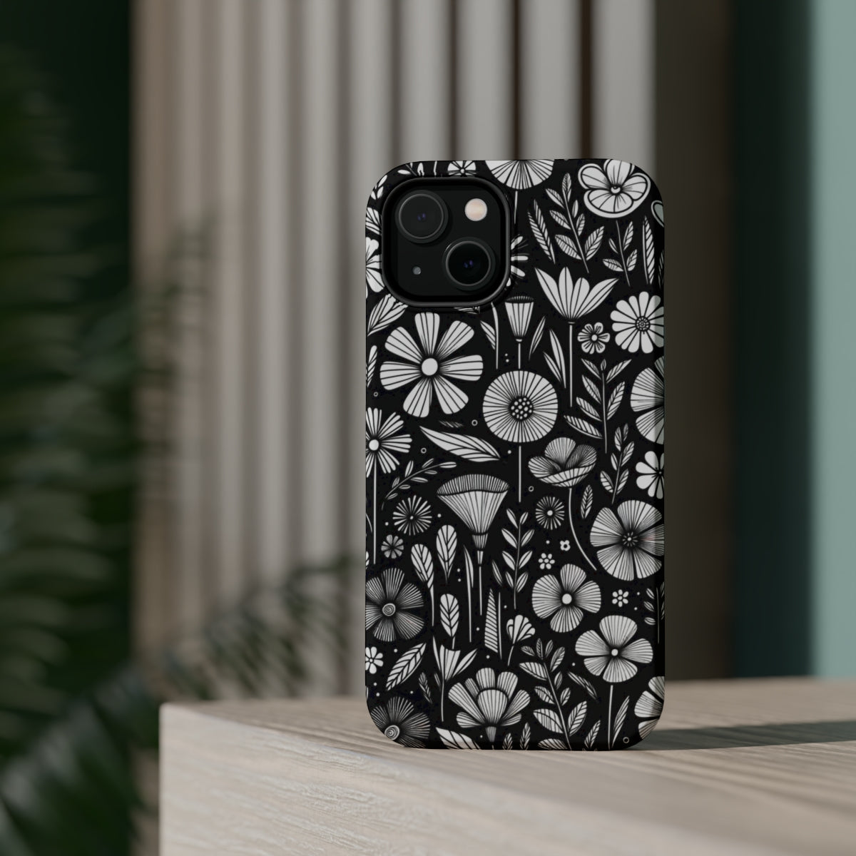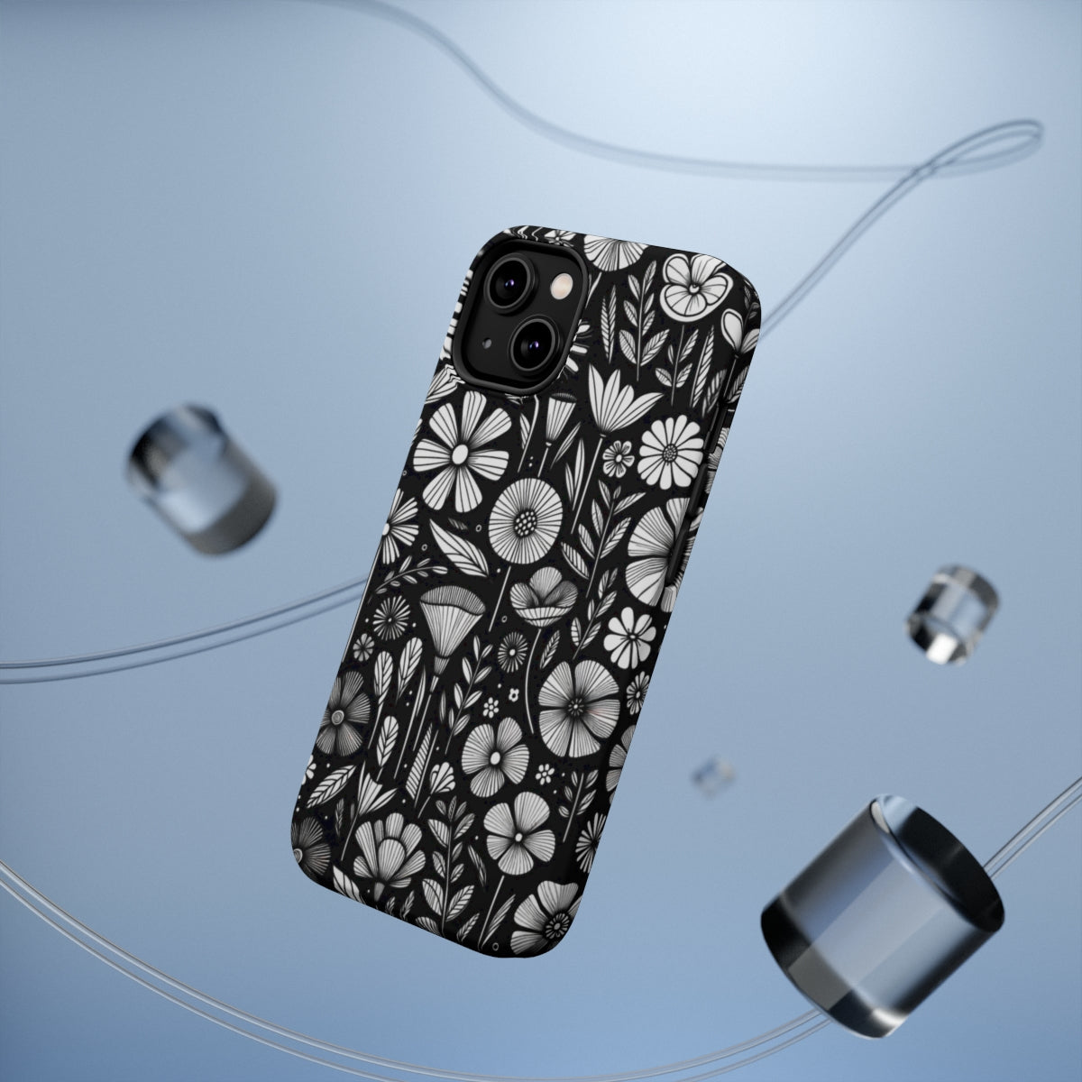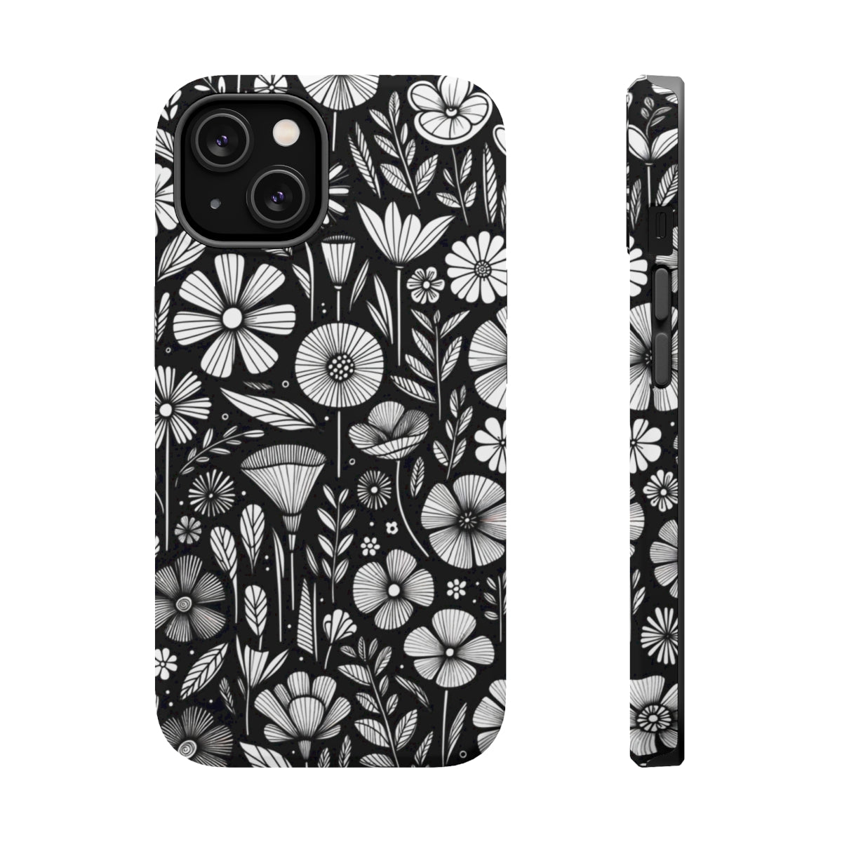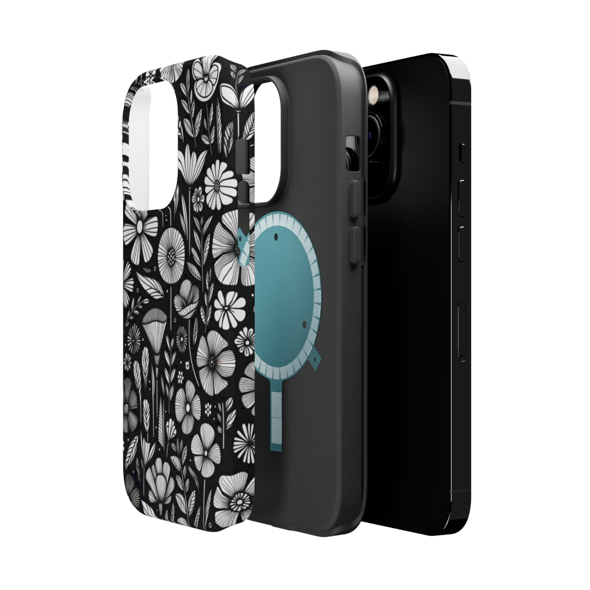 DistinctInk Tough Case for Apple iPhone, Compatible with MagSafe Charging - Whimsical Garden: Hand-drawn Cartoon Flowers