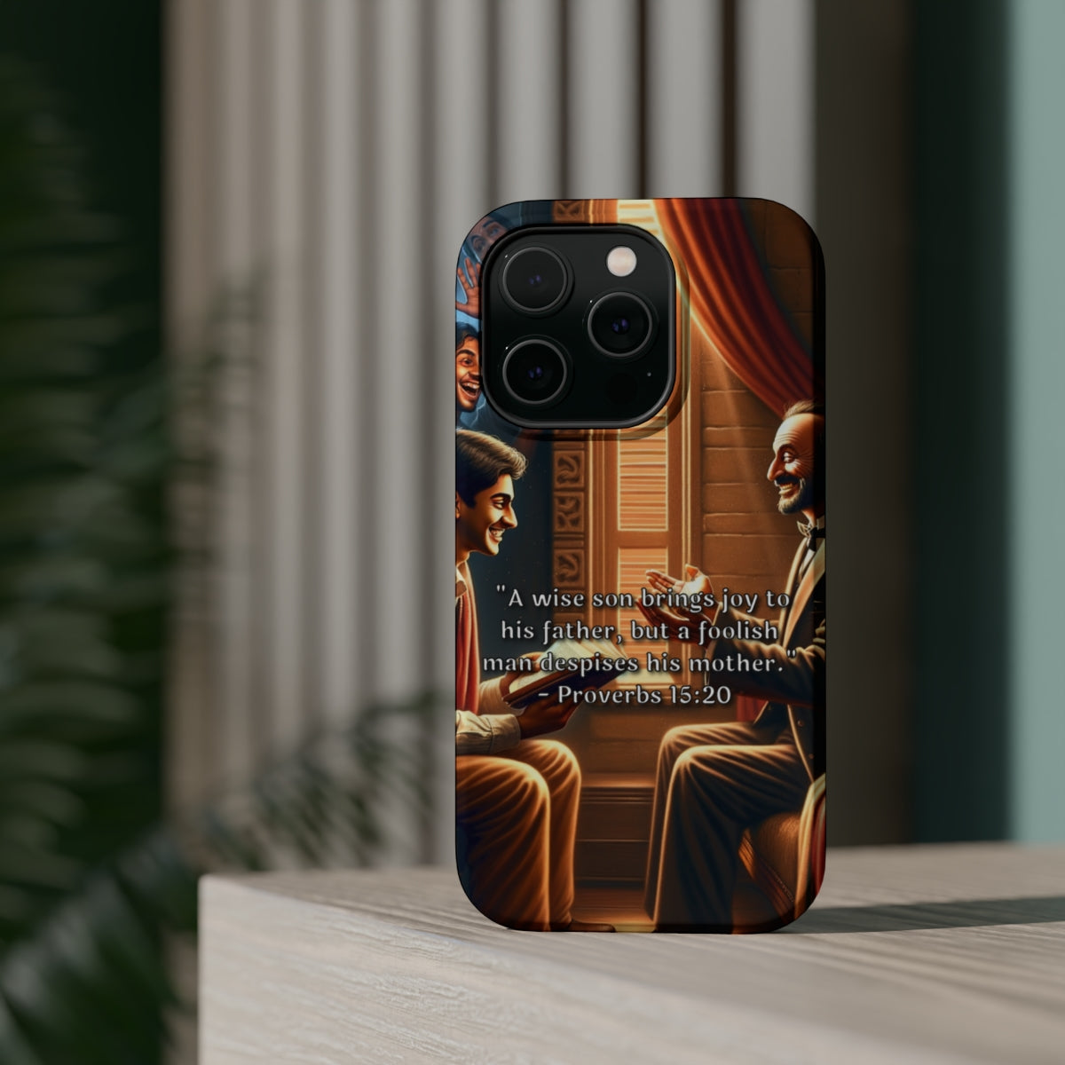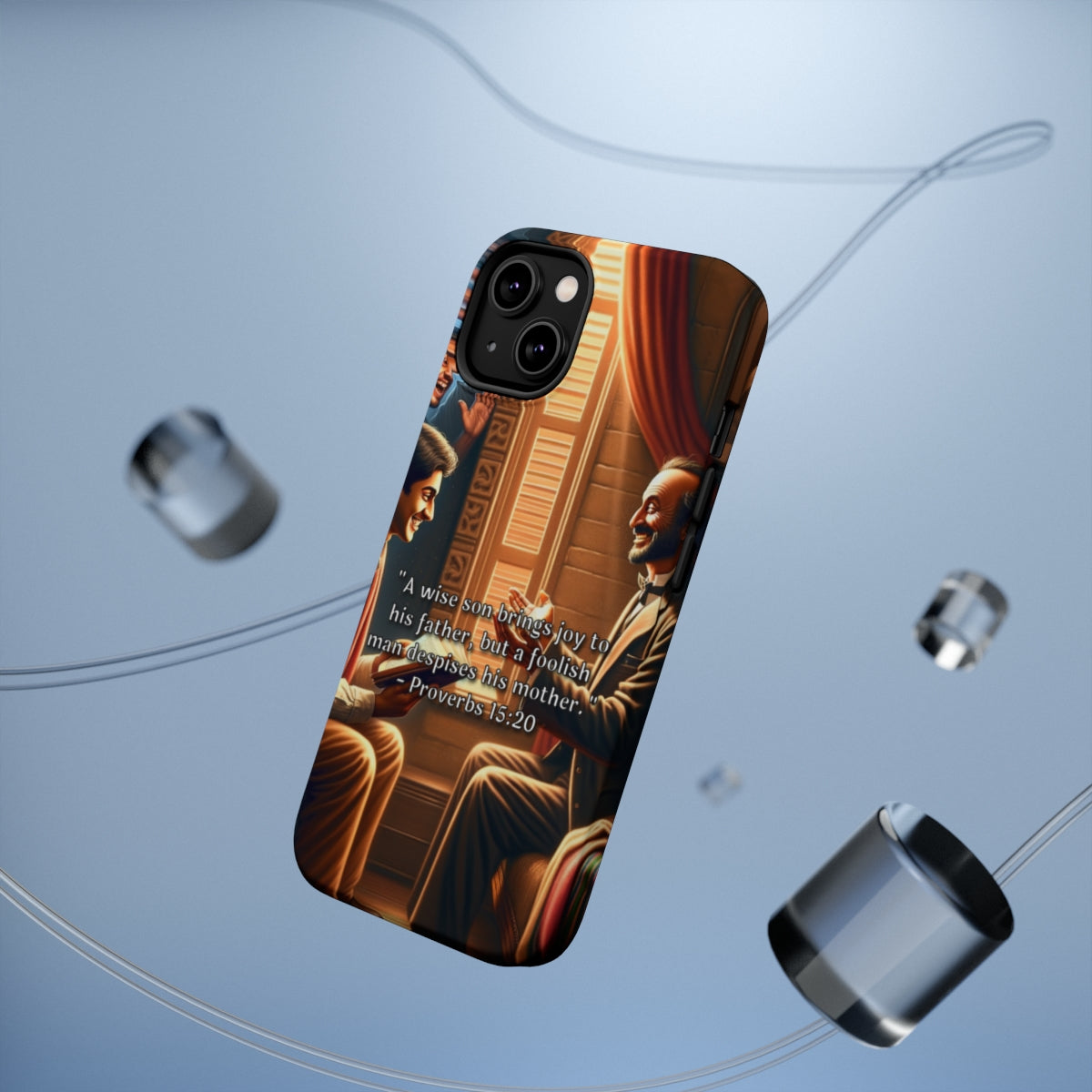 DistinctInk Tough Case for Apple iPhone, Compatible with MagSafe Charging - "Wise Son, Joyful Father: Proverbs 15:20 Reveals Wisdom's Impact"