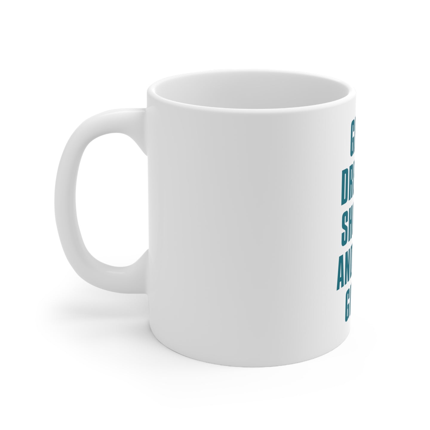 This sturdy mug is perfect for your morning coffee, afternoon tea, or whatever hot beverage you enjoy. It's glossy white with a vivid print of our Get Up Dress Up Show Up Never Give Up desigh which will retain its quality when dish-washed and microwaved.