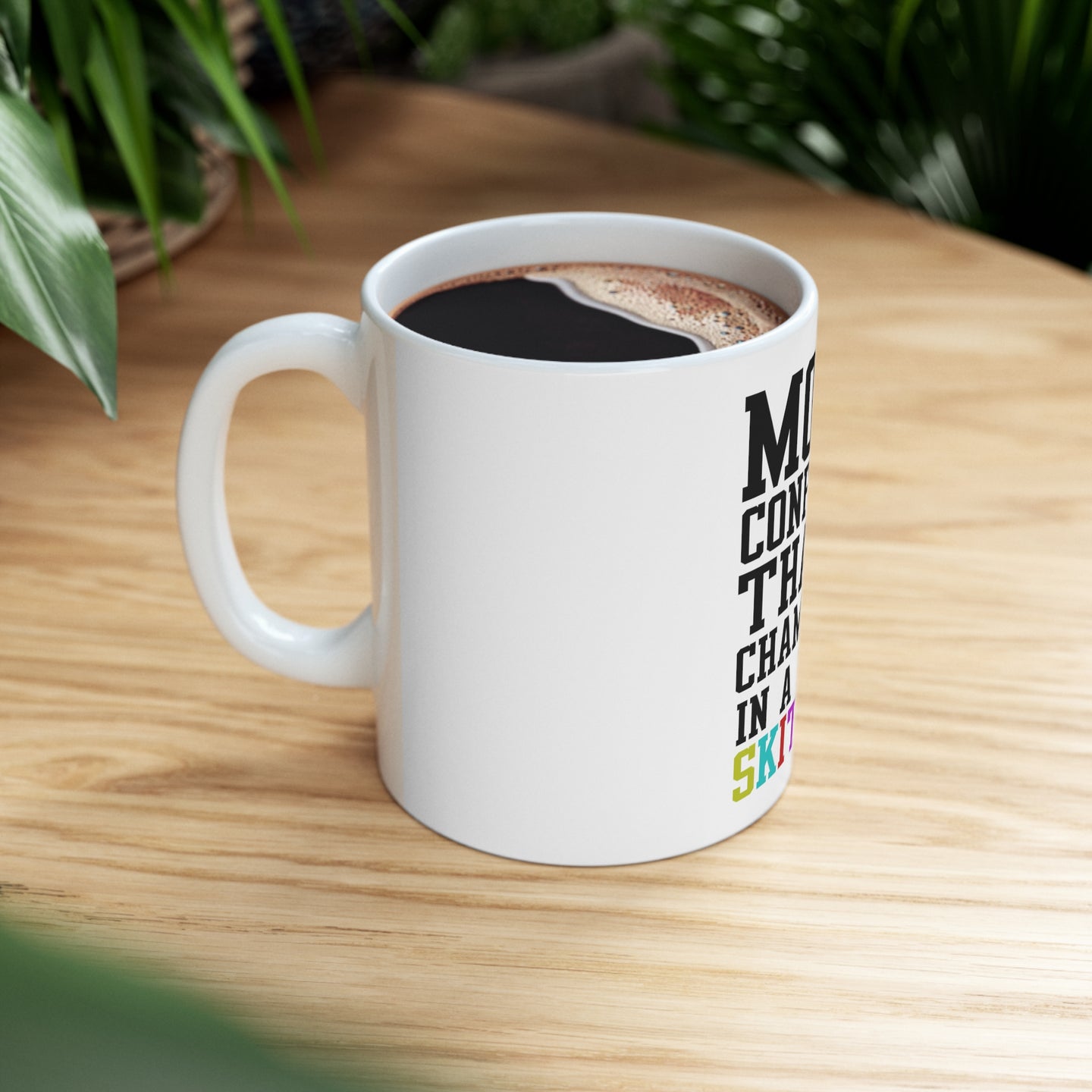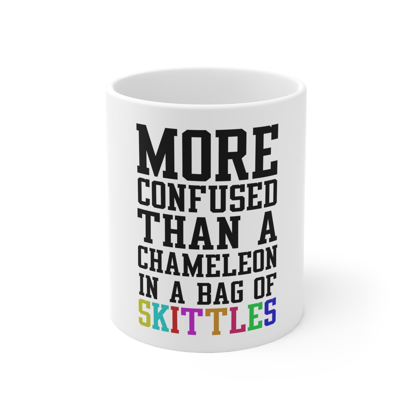 This glossy white coffee mug is great for those who love to drink their coffee with a touch of class. The More Confused than Chameleon in Skittles design is printed directly onto the mug, giving it a unique and trendy look. This mug is perfect for coffee lovers who want to start their day with a little bit of humor.