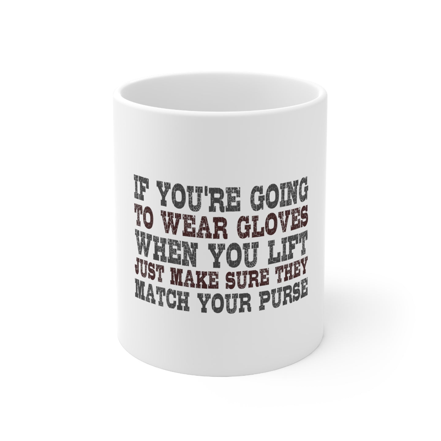This sturdy mug is perfect for your morning coffee, afternoon tea, or whatever hot beverage you enjoy. It's glossy white with a vivid print of our Wear Gloves When You Lift - Match Your Purse desigh which will retain its quality when dish-washed and microwaved.