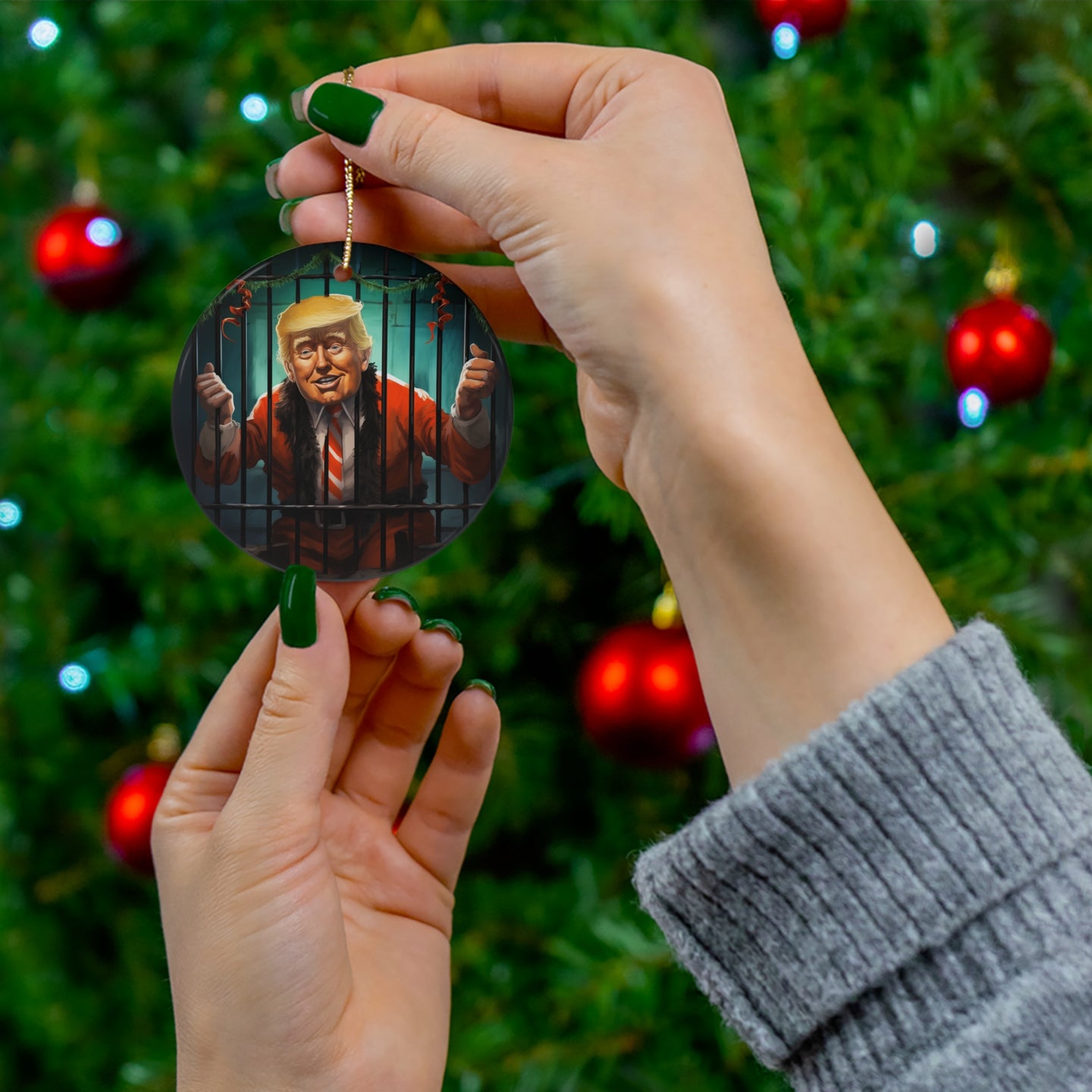 Ceramic Christmas tree ornament with bold design of Trump Celebrates Christmas in Jail printed on both sides. Unique and distinct 2.75" diameter ornament with gold string for easy hanging. Perfect holiday gift for any occasion or stocking stuffer. Spice up your celebrations with this DistinctInk exclusive design!