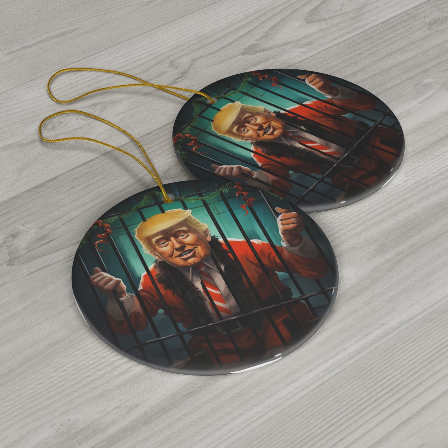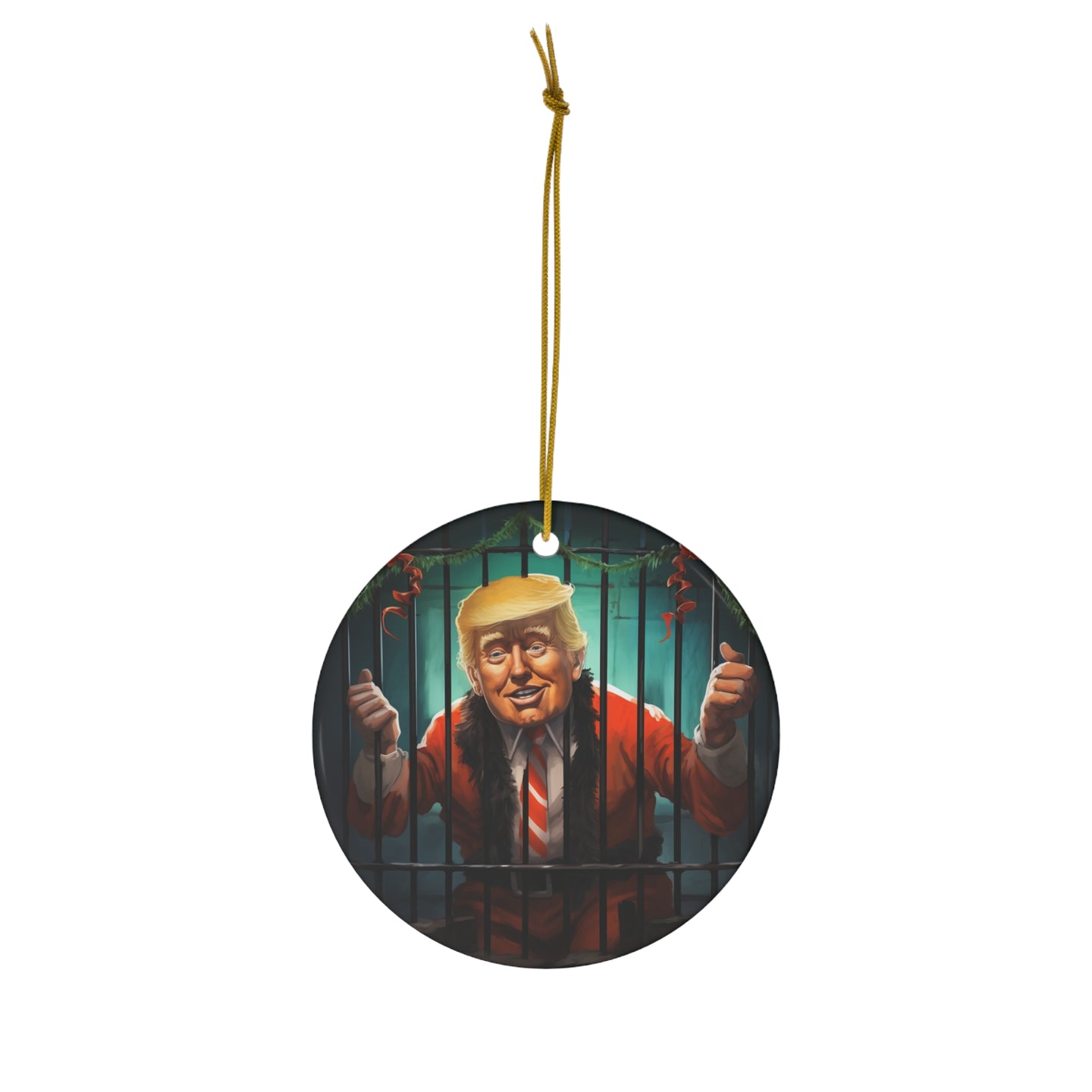 DistinctInk Hanging Ceramic Christmas Tree Ornament Charm with Gold String - Great Gift/Present - 2 3/4 inch Diameter - Trump Celebrates Christmas in Jail